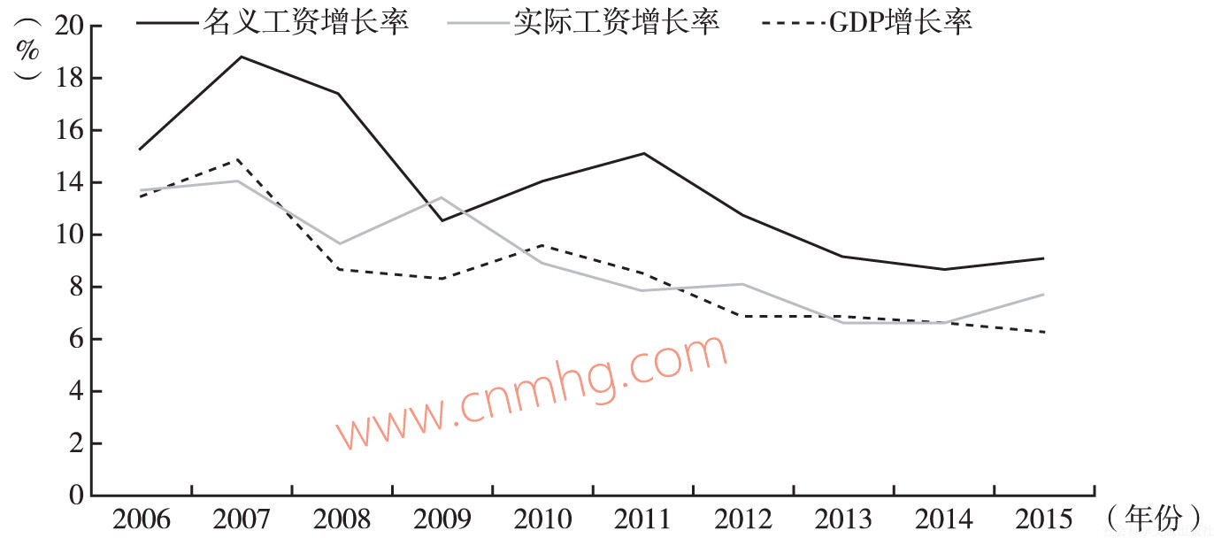 圖6-1 2006~2015年城鎮(zhèn)非私營(yíng)單位就業(yè)人員平均工資與經(jīng)濟(jì)增長(zhǎng)變化情況