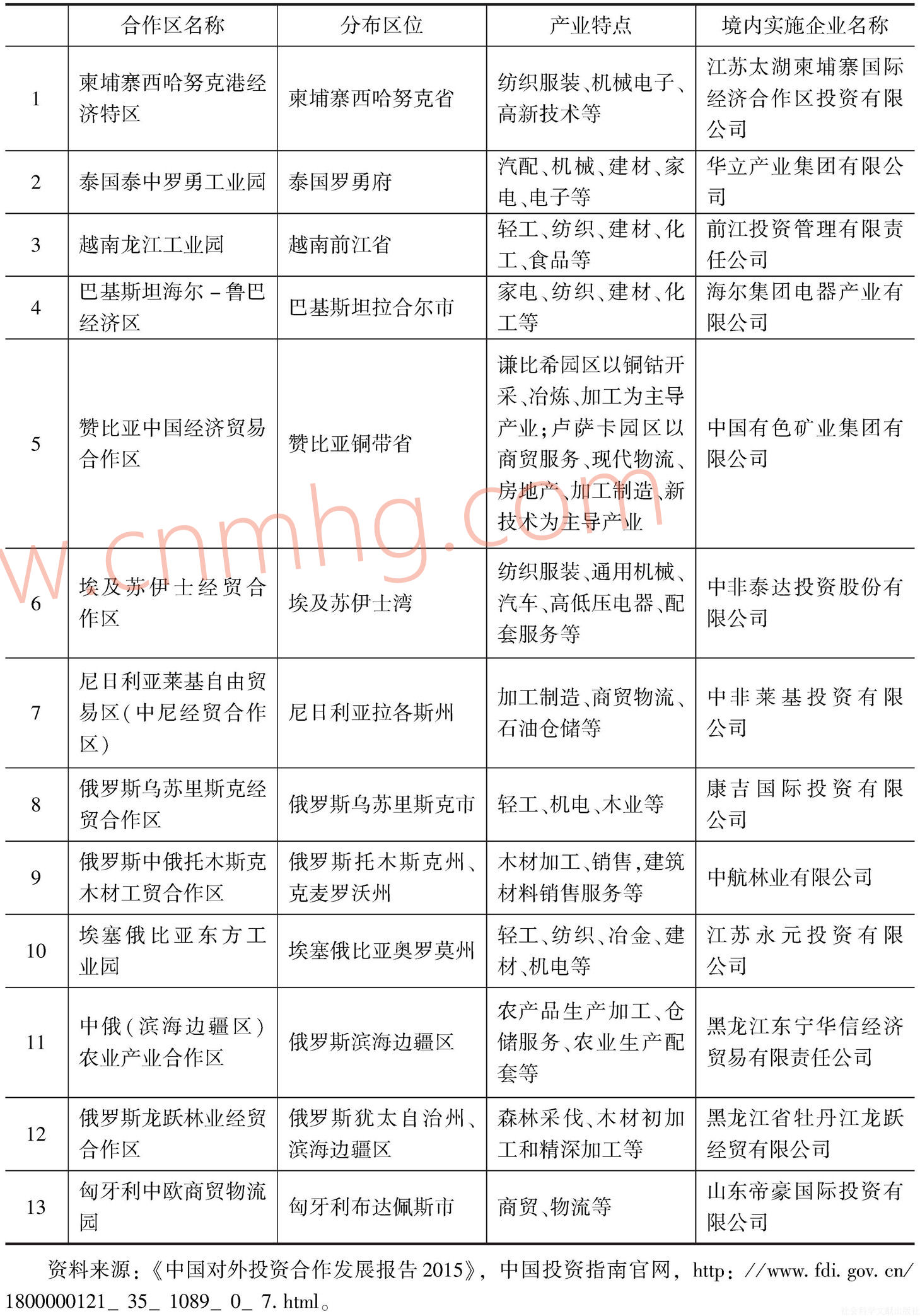 域外經(jīng)貿(mào)合作區(qū)是推進“一帶一路”倡議和國際產(chǎn)能與裝備制造合作的有效平臺,已成為促進中國和東道國經(jīng)貿(mào)合作雙贏的重要載體。據(jù)統(tǒng)計,截至2015年11月底,中國企業(yè)正在建設(shè)域外經(jīng)貿(mào)合作區(qū)75個,已通過確認考核的13個。在建的75個合作區(qū)中,53個分布在“一帶一路”沿線國家;已通過考核的13個合作區(qū)中,10個位于“一帶一路”沿線國家(見表1)。在建的75個合作區(qū)中,有一半以上是與國際產(chǎn)能合作相關(guān)的加工類項目;13家通過考核的合作區(qū),主導(dǎo)產(chǎn)業(yè)涉及有色、輕紡、服裝、汽配、建材、家電等優(yōu)勢產(chǎn)業(yè)。[5]