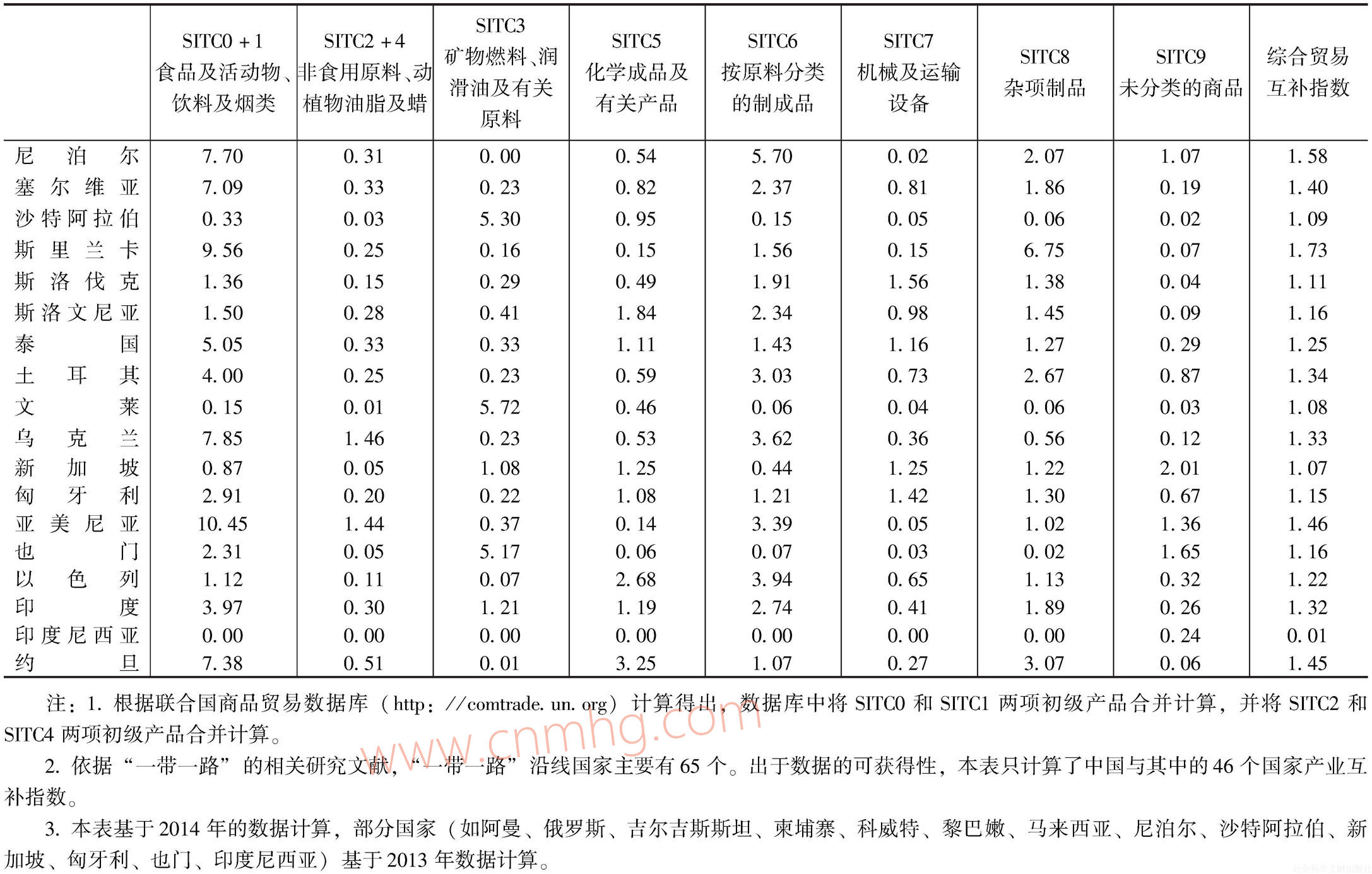 依據(jù)“一帶一路”的相關(guān)研究文獻,“一帶一路”沿線國家主要有65個(含中國)。出于數(shù)據(jù)的可獲得性,本處僅測算了中國與其中的46個國家的產(chǎn)業(yè)互補指數(shù),另外18個國家則沒有測算。