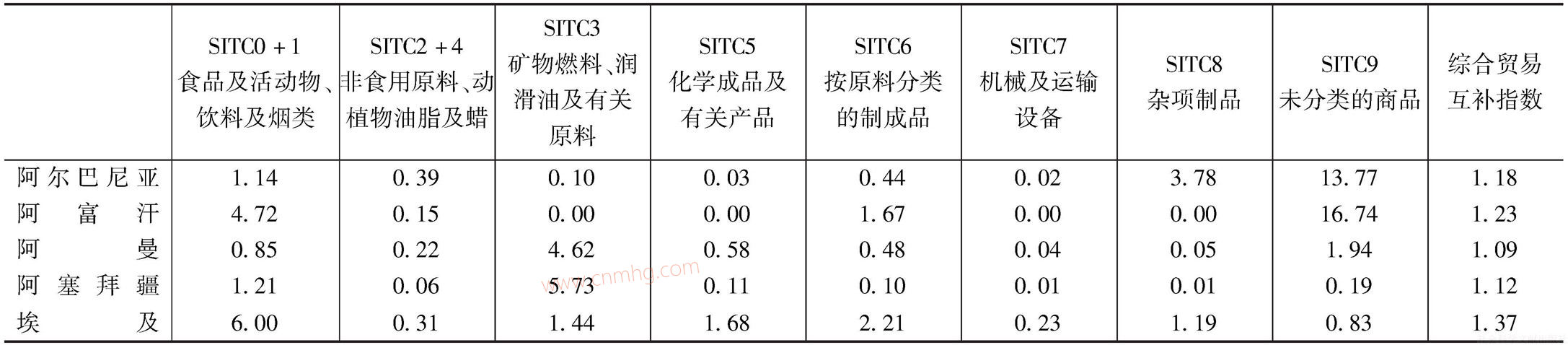 其次,分析中國進口、外國出口側(cè)的產(chǎn)業(yè)互補指數(shù)。表3顯示,除了蒙古和印度尼西亞,中國與“一帶一路”沿線國家的綜合產(chǎn)業(yè)互補指數(shù)均大于1,產(chǎn)能合作潛力巨大,而這種潛力在不同國家不同產(chǎn)業(yè)具有較大差異。以食品及活動物、飲料及煙類(SITC0、SITC1)為代表的初級產(chǎn)品計算,互補指數(shù)多數(shù)大于1甚至遠高于1,互補效應(yīng)顯著;同樣是初級產(chǎn)品的礦物燃料、潤滑油及有關(guān)原料(SITC3),阿曼、阿塞拜疆、俄羅斯、哈薩克斯坦、科威特、沙特阿拉伯、文萊和也門的互補指數(shù)遠高于1,與中國當(dāng)前油氣資源需求上升相匹配,建設(shè)“一帶一路”可以通過開發(fā)油氣能源新來源緩解當(dāng)前的困境;隨著中國人口紅利逐漸收縮,以按原料分類的制成品(SITC6)和雜項制品(SITC8)為代表的勞動密集型產(chǎn)品也是中國進口的重點,其中部分國家的互補指數(shù)高于甚至遠高于1,互補效應(yīng)明顯;而與中國當(dāng)前進口需求互補效應(yīng)較小的包括以非食用原料(燃料除外)、動植物油脂及蠟(SITC2、SITC4)為代表的初級產(chǎn)品,和以化學(xué)產(chǎn)品及有關(guān)產(chǎn)品(SITC5)、機械及運輸設(shè)備(SITC7)為代表的資本、技術(shù)密集型產(chǎn)品,大多數(shù)互補指數(shù)小于1,互補效應(yīng)不明顯,不是中國進口的重點;以未分類的產(chǎn)品(SITC9)為代表的資本密集型產(chǎn)品也不是我國進口的突出領(lǐng)域,盡管阿爾巴尼亞、阿富汗、吉爾吉斯斯坦、黎巴嫩與中國在這方面的互補指數(shù)遠高于1,但這些國家該產(chǎn)品的出口額非常有限。由此可見,多數(shù)初級產(chǎn)品生產(chǎn),尤其是油氣國的油氣產(chǎn)品生產(chǎn)是中國與“一帶一路”沿線國家開展產(chǎn)能合作的重點領(lǐng)域;一些勞動力資源豐富的國家,是中國將勞動密集型產(chǎn)業(yè)轉(zhuǎn)移出去的首選目的地。