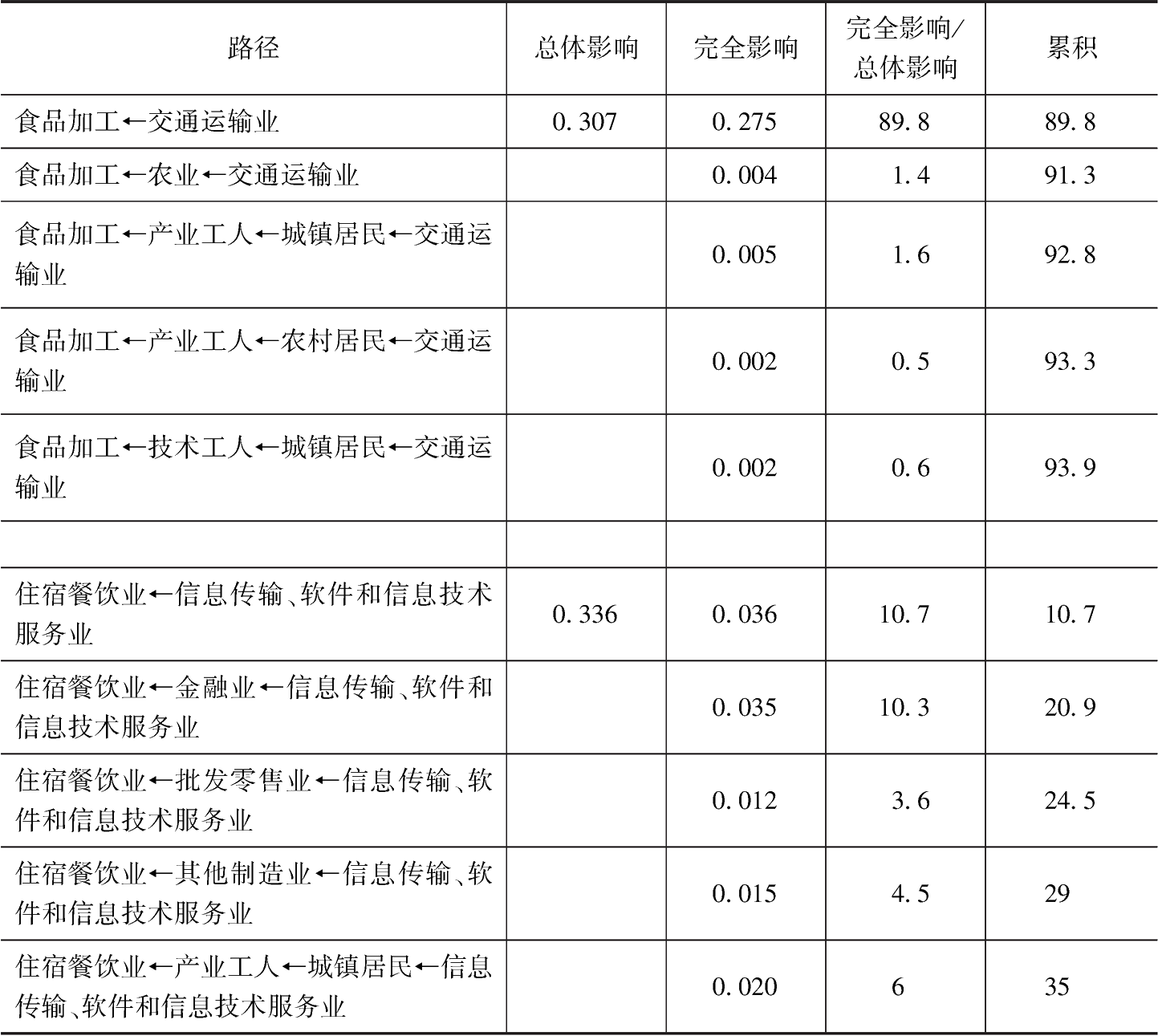 部分部門之間的相互影響主要是通過間接路徑發(fā)揮作用的。從信息傳輸、軟件和信息技術(shù)服務(wù)業(yè)對住宿餐飲業(yè)的價格傳導效應看,通過兩部門之間這種最短路徑所產(chǎn)生的效應僅占總體效應的10.7%,其他25%的效應是通過信息傳輸、軟件和信息技術(shù)服務(wù)業(yè)對金融業(yè)、批發(fā)零售業(yè)、其他制造業(yè)以及城市居民進一步影響到住宿餐飲業(yè)的,而且這五條最主要路徑所包含的傳導效果僅占總體效果的35%。因此,信息傳輸、軟件和信息技術(shù)服務(wù)業(yè)對住宿餐飲業(yè)之間的傳導路徑是非常多、非常復雜的。