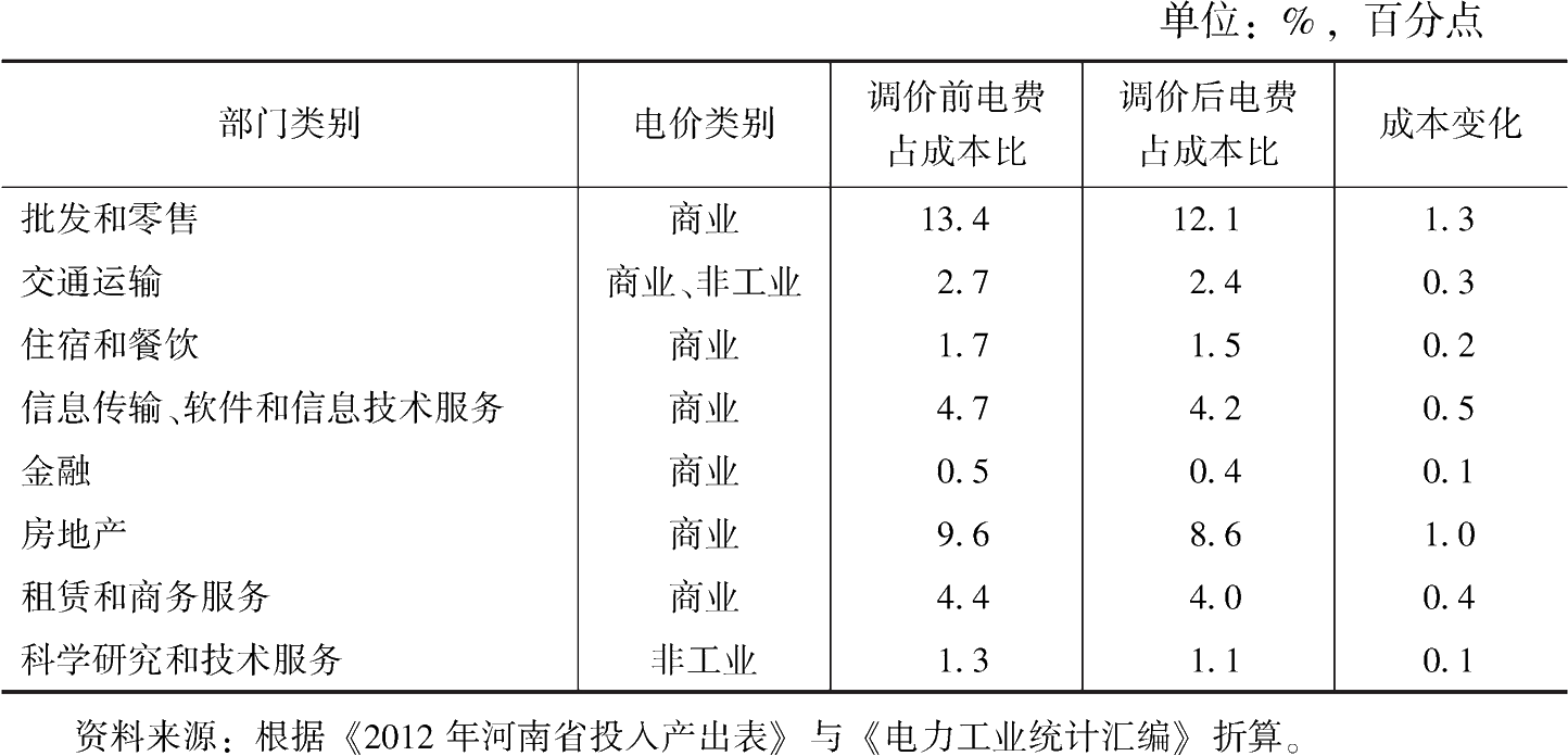 表4 河南省執(zhí)行一般工商業(yè)電價的主要部門調(diào)價前后電費占成本支出比例