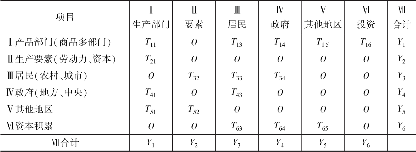 表2中數(shù)據(jù)來源于投入產(chǎn)出表,第一行反映了經(jīng)濟各部門投入和產(chǎn)出使用情況,第二行反映了各種勞動力、資本、土地所獲得的要素收入及分配情況,第三行反映了不同居民家庭的收入來源、消費和儲蓄情況,第四行反映了政府的收入和支出情況,第五行反映了從國內(nèi)或國外其他地區(qū)的商品進出口情況,第六行反映了社會的儲蓄和投資核算。