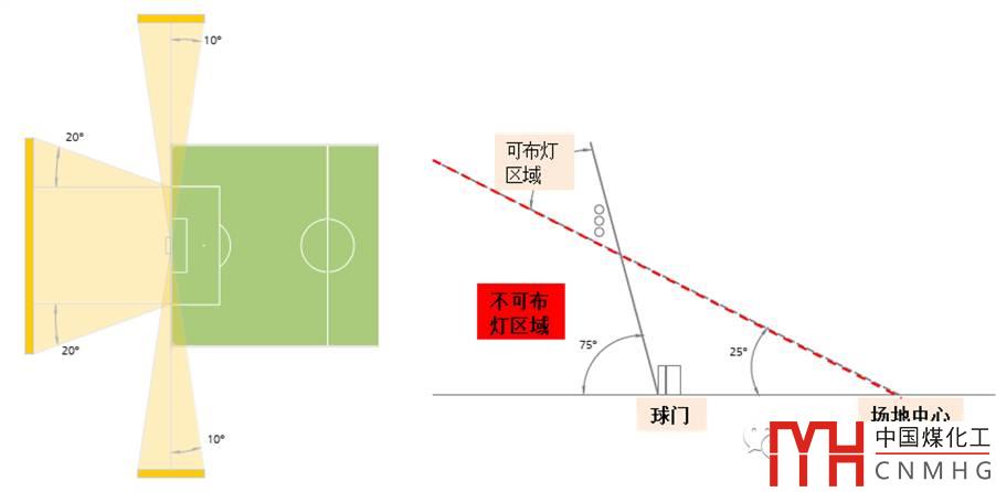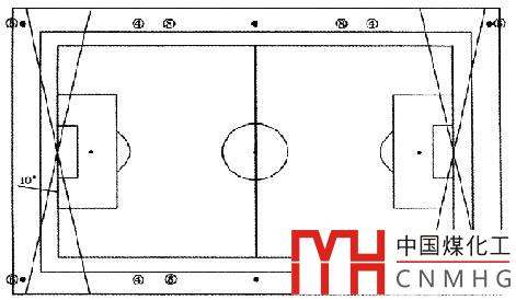 燈桿要均勻布置,可布置4塔、6塔或8塔,投射角大于25°,至場(chǎng)地邊線(xiàn)投射角最大不超過(guò)75°。