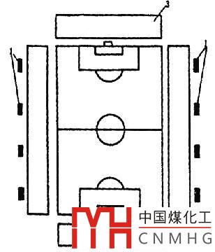 多桿布置是兩側(cè)布置的一種形式,兩側(cè)布置是燈具與燈桿或建筑馬道結(jié)合、以簇狀集中或連續(xù)光帶形式布置在比賽場(chǎng)地兩側(cè)。顧名思義,多桿布置型式是在場(chǎng)地兩側(cè)設(shè)置多組燈桿(或燈桿)見(jiàn)圖14-9,適用于足球練習(xí)場(chǎng)地、網(wǎng)球場(chǎng)地等。它的突出優(yōu)點(diǎn)是用電量較省,垂直照度與水平照度之比較好。由于燈桿較低,這種布燈型式還有投資較少,維護(hù)方便的優(yōu)點(diǎn)。
