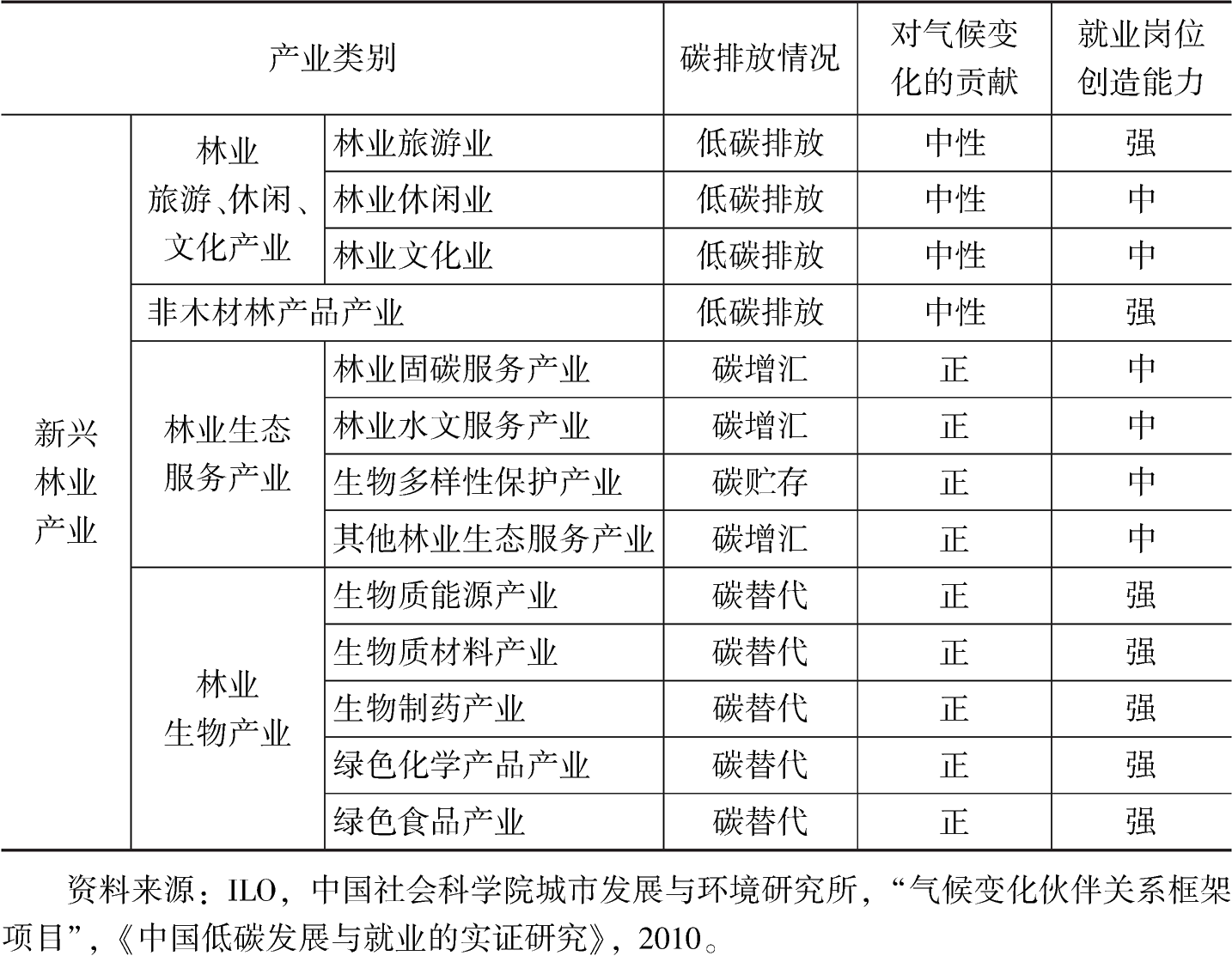 林業(yè)本身就是一個完整的產(chǎn)業(yè)鏈,既包括第一產(chǎn)業(yè),也包括第二產(chǎn)業(yè)和第三產(chǎn)業(yè)。表3從傳統(tǒng)林業(yè)和新興林業(yè)兩個角度對林業(yè)相關(guān)產(chǎn)業(yè)的碳排放情況及勞動力的吸納能力進行了定性分析。從中不難看出,林業(yè)產(chǎn)業(yè)的開發(fā)既有利于減緩或適應(yīng)氣候變化,也可以創(chuàng)造大量的綠色就業(yè)崗位。積極發(fā)展與林產(chǎn)品相關(guān)的加工制造業(yè)、林副產(chǎn)業(yè)、休閑旅游服務(wù)業(yè),有助于促進中國的低碳就業(yè)轉(zhuǎn)型。