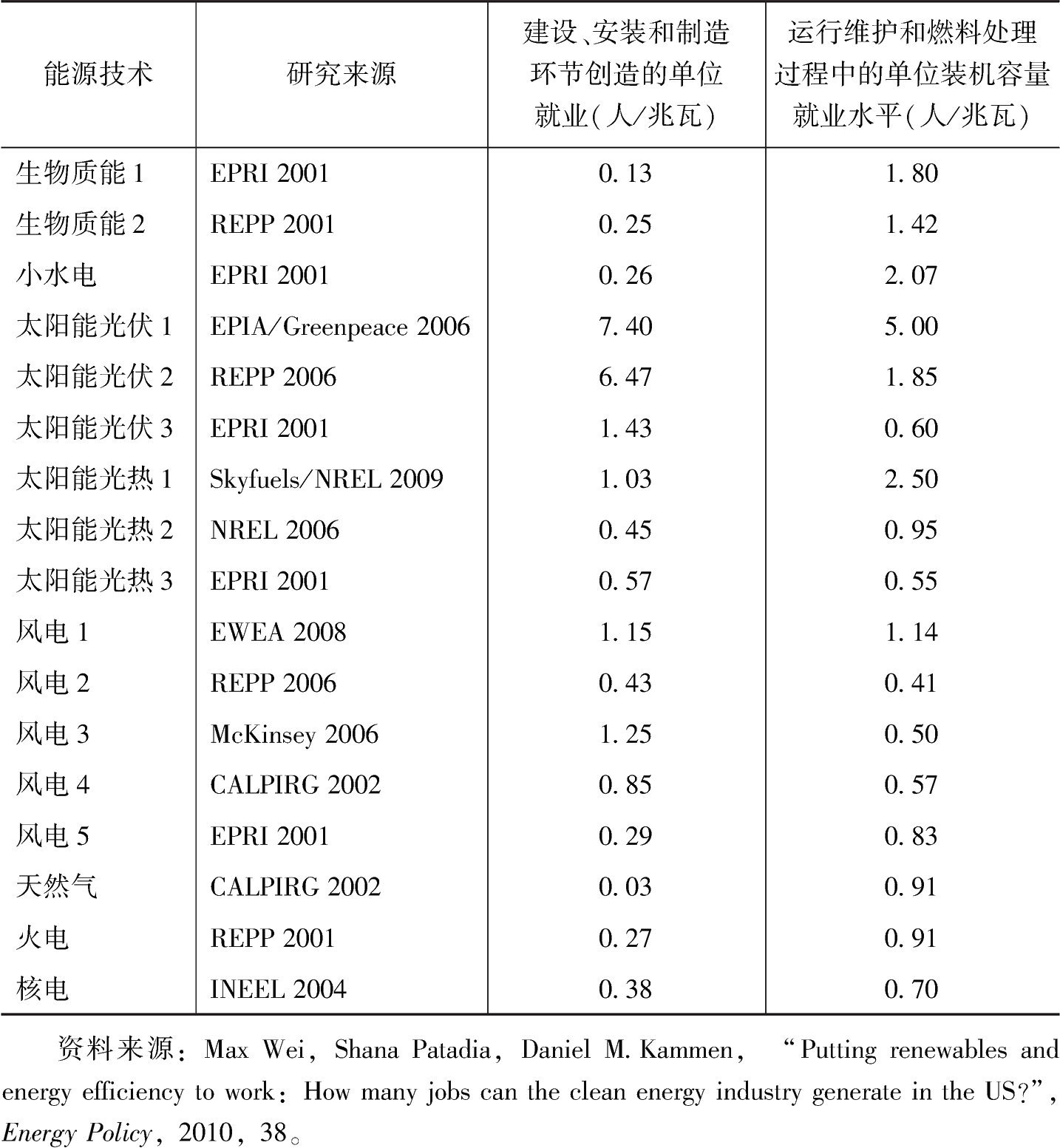 由于火電技術(shù)已經(jīng)相對比較成熟,一些大型發(fā)電機組和發(fā)電廠所創(chuàng)造的勞動就業(yè)機會相當(dāng)有限。一項針對美國的研究表明,可再生能源和清潔能源發(fā)電在建設(shè)、安裝及設(shè)備制造以及日常運行維護過程所創(chuàng)造的就業(yè)機會要多于傳統(tǒng)的火力發(fā)電(見表2),因此,電力部門的能源結(jié)構(gòu)調(diào)整,用清潔能源發(fā)電來替代火電,具有幫助實現(xiàn)減排目標(biāo)和創(chuàng)造更多就業(yè)的“雙重紅利”效應(yīng)。氣候政策下電力部門低碳轉(zhuǎn)型對產(chǎn)業(yè)整體的就業(yè)影響在初期主要體現(xiàn)為火電部門就業(yè)減少的負面影響;但是隨著時間的推移,從長期看電力部門對就業(yè)的影響會因為新能源的規(guī)模擴張效應(yīng)而體現(xiàn)為正面、積極的影響。