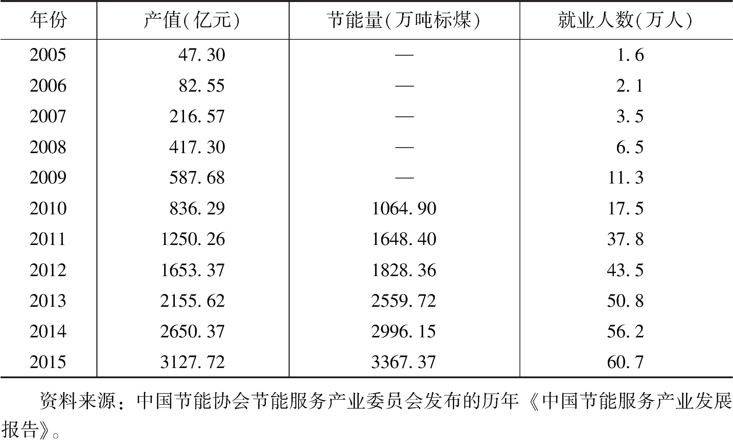 表4 2005~2015年節(jié)能服務(wù)產(chǎn)業(yè)產(chǎn)值、節(jié)能量和就業(yè)人數(shù)變化趨勢