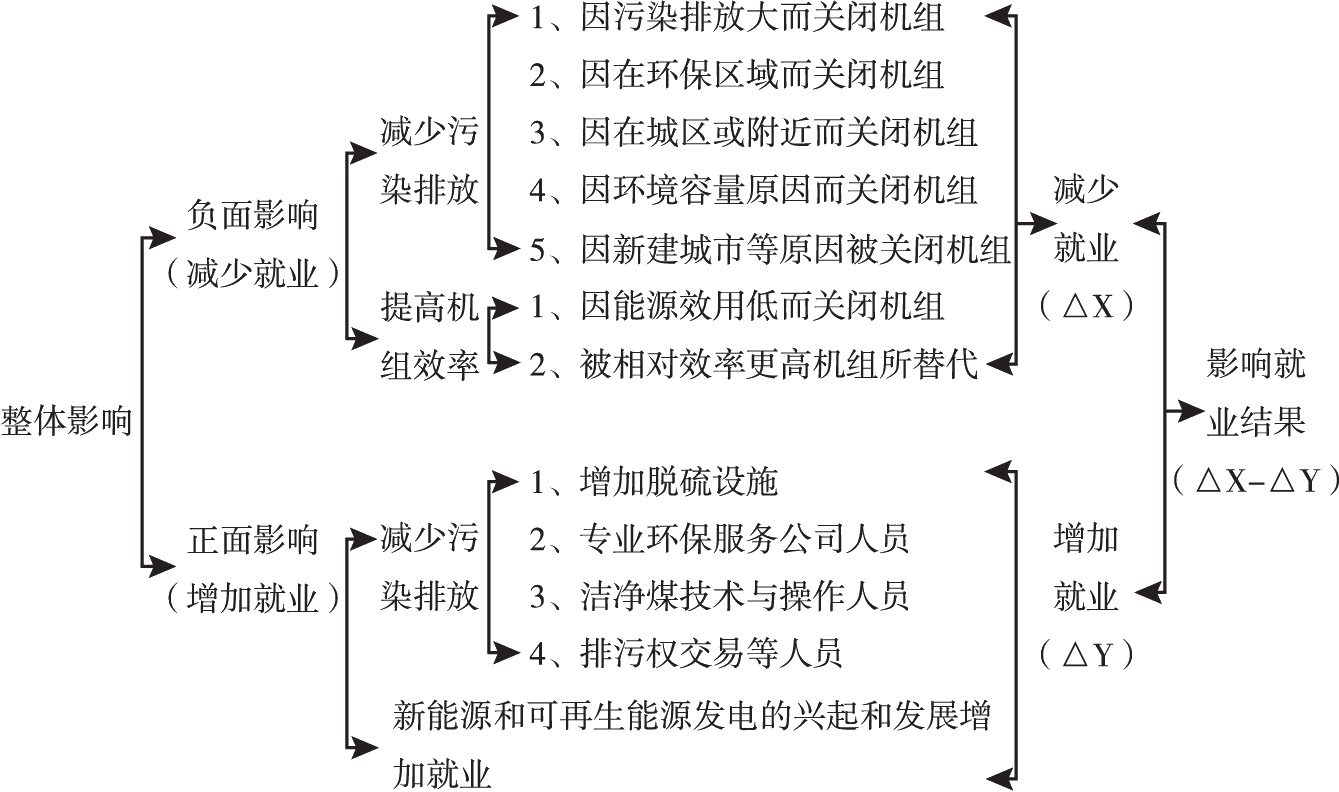 為了實現(xiàn)溫室氣體減排,需要調(diào)整電力行業(yè)的能源使用結(jié)構(gòu),從傳統(tǒng)的化石能源發(fā)電(主要是煤炭發(fā)電)向清潔的可再生能源發(fā)電轉(zhuǎn)移,這個過程將對行業(yè)就業(yè)產(chǎn)生負面、正面兩方面的影響(見圖2)。首先,節(jié)能減排措施將關(guān)閉落后低效的小型火電機組,同時煤炭資源開發(fā)的合并重組,將會減少相應(yīng)崗位的就業(yè);其次,火電行業(yè)“上大壓小”政策及脫硫改造設(shè)施將帶動新增崗位的就業(yè);最后,低碳的綠色能源如風(fēng)力發(fā)電、太陽能發(fā)電、水力發(fā)電、生物質(zhì)能發(fā)電、地?zé)岚l(fā)電、潮汐能發(fā)電等,具有相當(dāng)巨大的發(fā)展?jié)摿Γ瑒?chuàng)造綠色就業(yè)的直接與間接效應(yīng)也非常顯著。