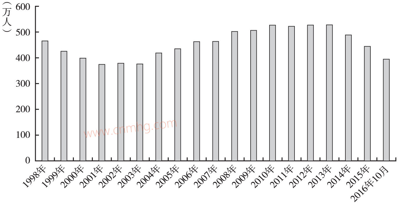 煤炭開采和洗選行業(yè)的就業(yè)總規(guī)模隨時間的推移,呈現(xiàn)出不同的增長趨勢,如圖3所示。1998~2003年,煤炭開采和洗選行業(yè)的就業(yè)人數(shù)存在小幅波動,但是總體上仍然呈現(xiàn)出下降態(tài)勢,從464萬人降至376萬人左右;然后隨著煤炭行業(yè)步入“黃金十年”的快速發(fā)展期,就業(yè)規(guī)模也基本保持增長態(tài)勢,到2013年達到峰值水平529萬人;隨后,隨著行業(yè)景氣下降、機械生產(chǎn)率水平提高以及環(huán)保標(biāo)準(zhǔn)的不斷加強,煤炭行業(yè)呈現(xiàn)出總量寬松、結(jié)構(gòu)性過剩的態(tài)勢。煤炭需求低速增長,產(chǎn)能快速釋放,進口不斷增加,全社會煤炭庫存一直在持續(xù)上升,價格下滑,效益下降,市場景氣持續(xù)偏冷,企業(yè)經(jīng)營困難加大,一些煤炭企業(yè)開始出現(xiàn)貸款發(fā)工資和延遲發(fā)放工資的現(xiàn)象,不斷有小企業(yè)倒閉。受此影響,行業(yè)整體的就業(yè)規(guī)模也不斷縮減。到2014年末已經(jīng)迅速降至488萬人,短短1年時間內(nèi)已經(jīng)減少了41萬人,到2015年底降至443萬人。2016年10月的最新數(shù)字顯示,煤炭行業(yè)的就業(yè)總規(guī)模已經(jīng)降至395.5萬人左右。