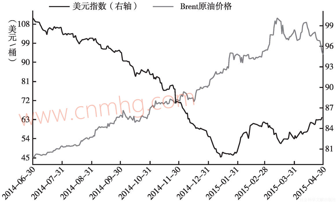圖2.12 國際石油價格與美元指數(shù)(2014年6月~2015年4月)