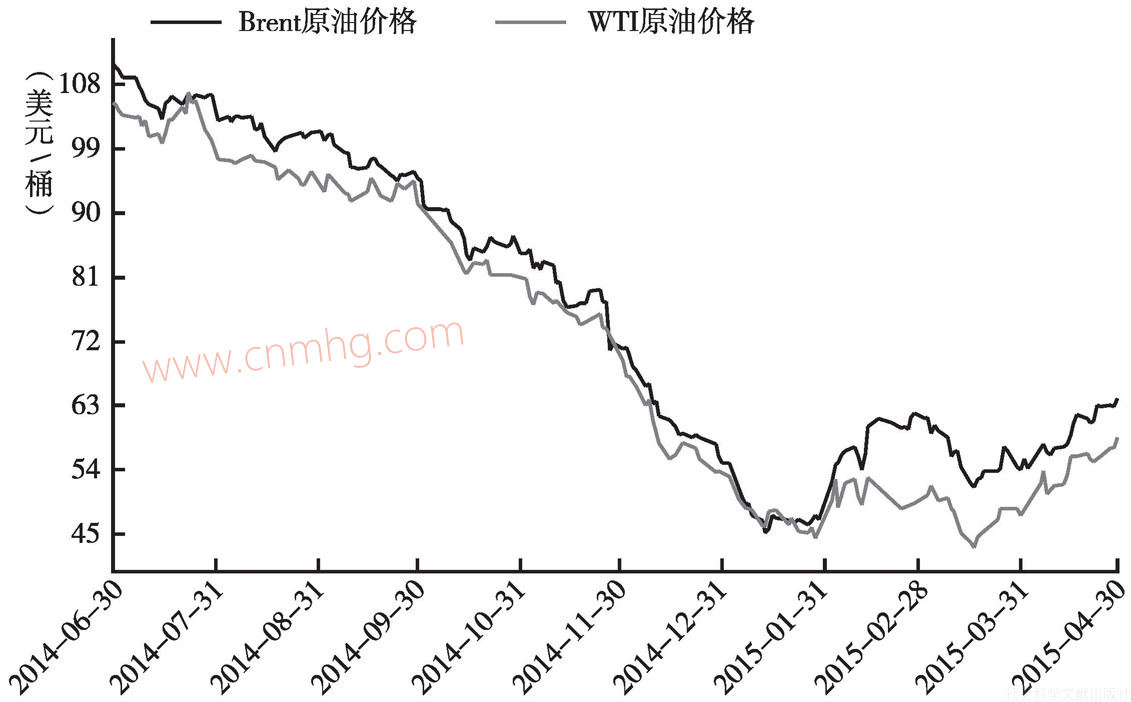 圖2.11 國際石油價格(2014年6月~2015年4月)