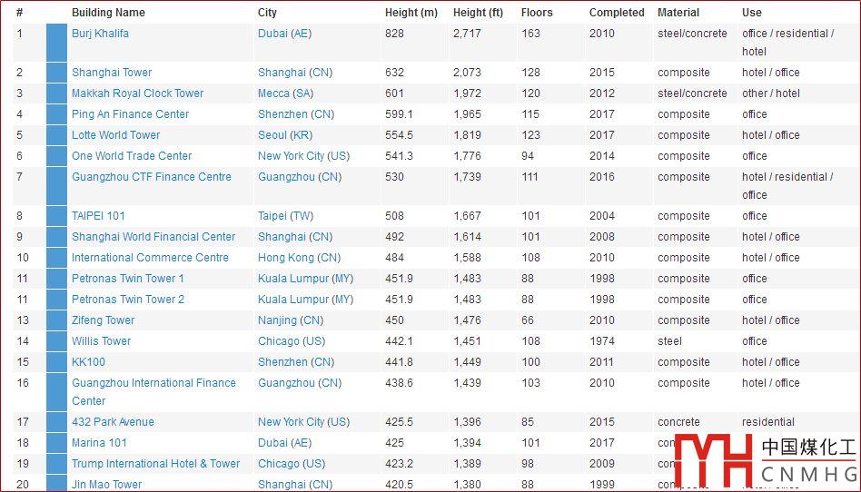 下表所示,全球已建成的超高層建筑高度TOP 20中,中國占據(jù)一半。
