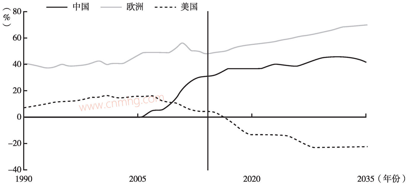 圖1-2 歐洲、中國和美國的天然氣進(jìn)口占消費(fèi)的比重(1990~2035年)