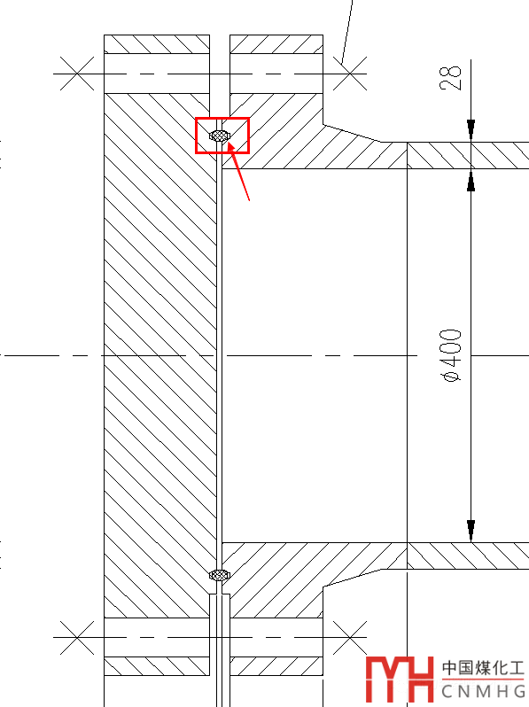 為了降低法蘭的重量,雖然是13.3MPa的設(shè)計(jì)壓力,但是還是采用DN400-600#的美標(biāo)法蘭尺寸,然后將其尺寸按照GB150的法蘭設(shè)計(jì)方法進(jìn)行計(jì)算,經(jīng)過加厚法蘭盤厚度,設(shè)備法蘭計(jì)算合格。