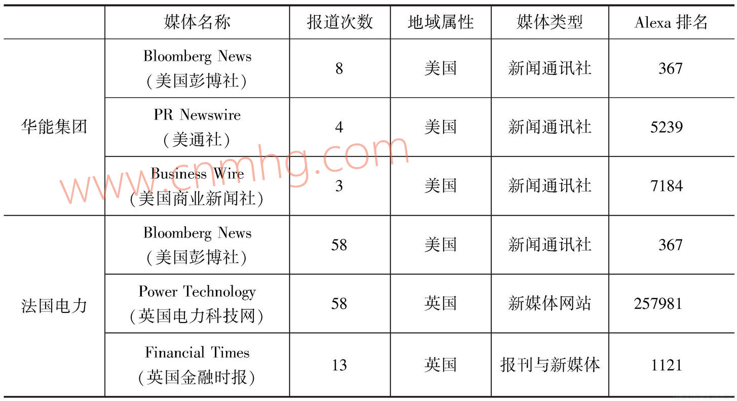 通過(guò)對(duì)國(guó)有電力能源企業(yè)在海外媒體新聞量的排名結(jié)果的梳理,確定對(duì)國(guó)有電力能源企業(yè)進(jìn)行報(bào)道的媒體排名榜,分別確定對(duì)中國(guó)華能集團(tuán)和法國(guó)電力公司報(bào)道數(shù)量占據(jù)前三名的媒體。對(duì)這些媒體進(jìn)行報(bào)道次數(shù)、地理屬性、媒體的類(lèi)型以及影響力進(jìn)行分析,其影響力主要參考在Alexa當(dāng)中的排名,從而評(píng)估這些媒體對(duì)國(guó)有電力能源企業(yè)報(bào)道的影響力程度。