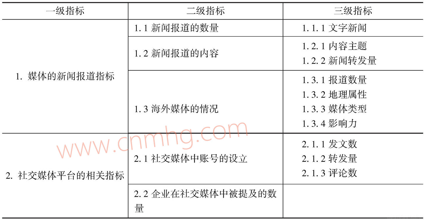 每一項(xiàng)一級(jí)指標(biāo)應(yīng)分解為不同的二級(jí)指標(biāo),從不同方面展示一級(jí)指標(biāo)的主要內(nèi)容。如媒體的新聞報(bào)道指標(biāo)可分解為新聞報(bào)道的數(shù)量、新聞報(bào)道的內(nèi)容以及海外媒體的情況;社交媒體平臺(tái)的相關(guān)指標(biāo)可分解為社交媒體中賬號(hào)的設(shè)立、新聞發(fā)布的數(shù)量、企業(yè)在社交媒體中被提及的數(shù)量。另外,具體體現(xiàn)海外傳播力還包括三級(jí)指標(biāo),也就是一系列的量化指標(biāo),這涉及華能集團(tuán)海外傳播的各個(gè)環(huán)節(jié)和要素。