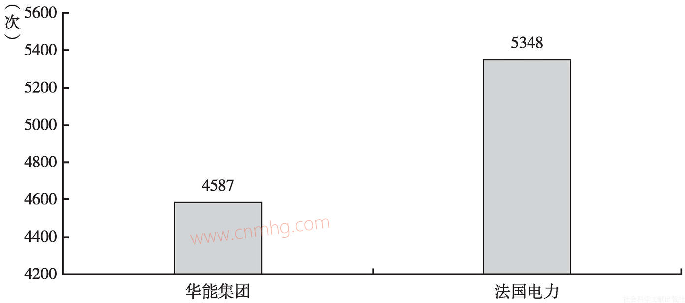 (3)盡管內(nèi)容主題上不存在差別,但從轉(zhuǎn)載數(shù)總量來(lái)看存在著明顯的差異(圖2)。中國(guó)華能集團(tuán)新聞轉(zhuǎn)載數(shù)前三位的新聞內(nèi)容轉(zhuǎn)載總量為4587條,而法國(guó)電力公司的轉(zhuǎn)載總量為5348條。轉(zhuǎn)載總數(shù)的差別與新聞總量的差別具有一定程度的相同的意義,也就是華能集團(tuán)在海外的傳播力存在不足。