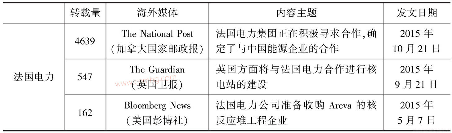 (4)從海外媒體的情況來(lái)看,法國(guó)電力公司更受到海外媒體的重視(表3)。對(duì)兩家國(guó)有電力能源企業(yè)報(bào)道最多的三家媒體,都屬于美、英兩國(guó)。對(duì)華能集團(tuán)報(bào)道最多的三家媒體分別是美國(guó)彭博社、美通社和美國(guó)商業(yè)新聞社。三家媒體均來(lái)自美國(guó),在Alexa當(dāng)中的排名分別為367位、5239位和7184位,其中只有彭博社的排名較為靠前。對(duì)法國(guó)電力公司報(bào)道最多的三家媒體分別為美國(guó)彭博社、英國(guó)電力科技網(wǎng)和《英國(guó)金融時(shí)報(bào)》,在Alexa當(dāng)中的排名分別為367位、257981位和1121位,同樣排名較靠前的只有彭博社。三家媒體中有兩家來(lái)自英國(guó),這也在一定程度上說(shuō)明,歐洲媒體更關(guān)注法國(guó)電力公司的相關(guān)發(fā)展。從媒體的影響力排名來(lái)看,除了彭博社以外,其他四家媒體排名均不突出,因此,無(wú)法直接看出兩家電力能源公司傳播力的差別。但值得注意的是,彭博社在對(duì)華能集團(tuán)和法國(guó)電力公司的報(bào)道數(shù)量中,分別占據(jù)兩家企業(yè)的第一位,但從報(bào)道次數(shù)上看,存在較大的差距。彭博社在2015年對(duì)華能集團(tuán)的報(bào)道次數(shù)為8次,而對(duì)法國(guó)電力公司的報(bào)道次數(shù)為58次(見(jiàn)表3)。因此,就彭博社而言,法國(guó)電力具有更高的企業(yè)傳播力。