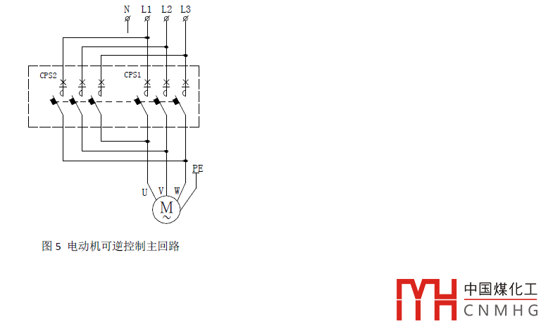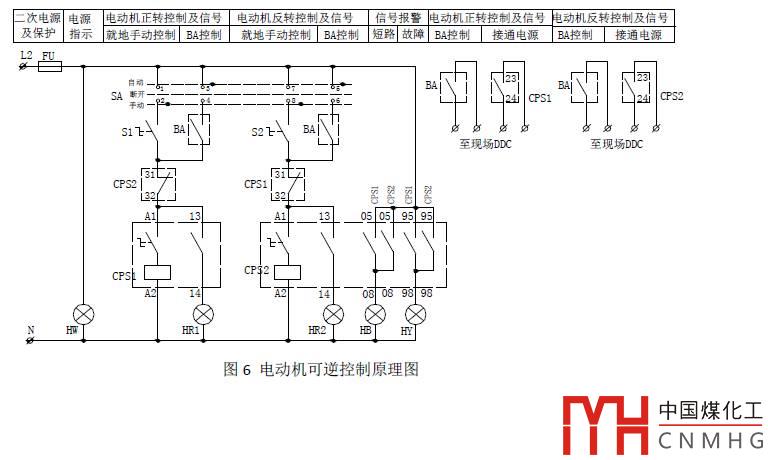 圖5和圖6分別為CPS組成的電動(dòng)機(jī)可逆控制的主回路和二次原理圖,CPS1、CPS2分別控制電動(dòng)機(jī)正轉(zhuǎn)和反轉(zhuǎn)的線圈,集成在CPS內(nèi),類(lèi)似分立元件構(gòu)成電動(dòng)機(jī)主回路中的接觸器,CPS本身具有機(jī)械聯(lián)鎖功能,正反轉(zhuǎn)的動(dòng)斷觸點(diǎn)分別串聯(lián)在對(duì)方的線圈回路,形成電氣聯(lián)鎖。本方案還具有BA自動(dòng)控制功能。
