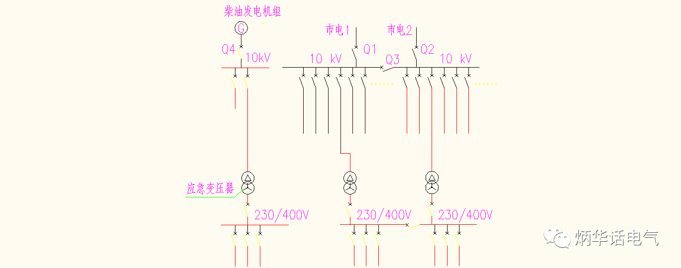 應(yīng)急情況下,柴油發(fā)電機組G啟動運行,開關(guān)Q5斷開,應(yīng)急系統(tǒng)與市電系統(tǒng)斷開,Q4閉合,由柴油發(fā)電機組為消防負(fù)荷供電。此時,G→Q4→應(yīng)急變壓器→消防負(fù)荷。