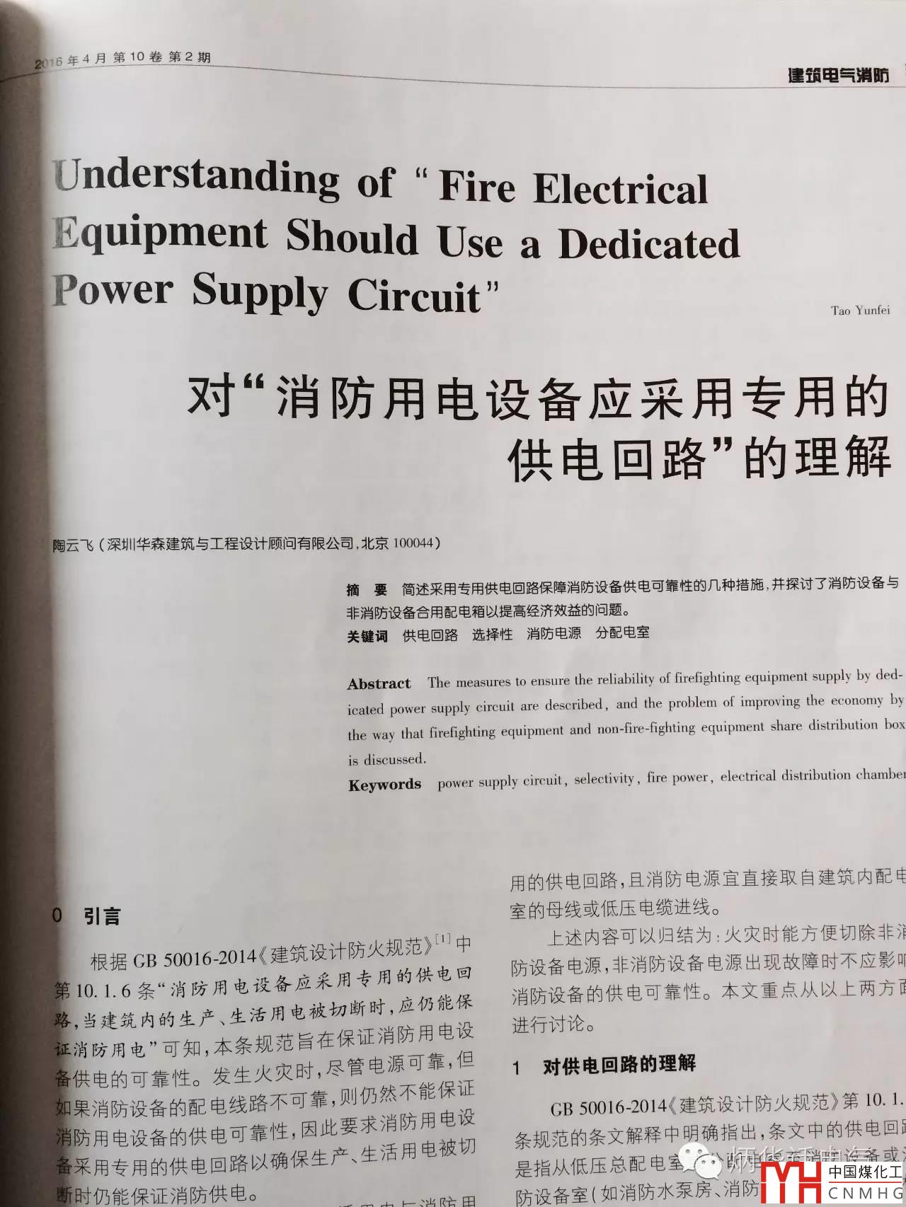 今天向大家推薦一篇文章,關于消防用電設備專用回路問題。這篇文章名為“對消防用電設備應采用專用的供電回路的理解”,作者是華森公司的陶云飛總工,該文發(fā)表在《智能建筑電氣技術》今年第2期上。相信這個問題大家經常遇到,《建筑設計防火規(guī)范》GB 50016-2014有明文規(guī)定,第10.1.6條為強制性條文,該條規(guī)定,消防用電設備應采用專用的供電回路,當建筑內的生產、生活用電被切斷時,應仍能保證消防用電。該條條文說明進行了解釋和說明,專用回來系不與其他負荷共用回路,直接從配電室低壓母線去電。