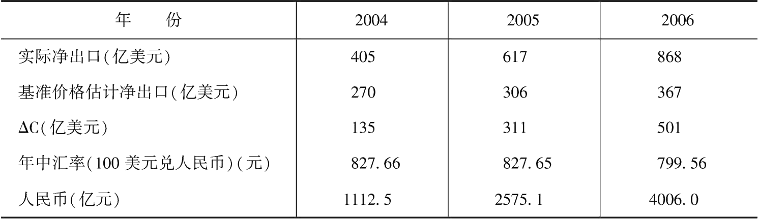 我們將表13-3及表13-5中的凈出口金額統(tǒng)一列在表13-6中,將表13-6中的第一行減去第二行就可以得每年的ΔC。根據(jù)每年年中的匯率(每年6月最后一個工作日)可以將美元折算為人民幣。從表13-6中可以看出,每年的ΔC呈現(xiàn)快速增大的趨勢,2004年ΔC為1112.5億元,到2006年已經(jīng)增長為4006億元,增長了近3倍。