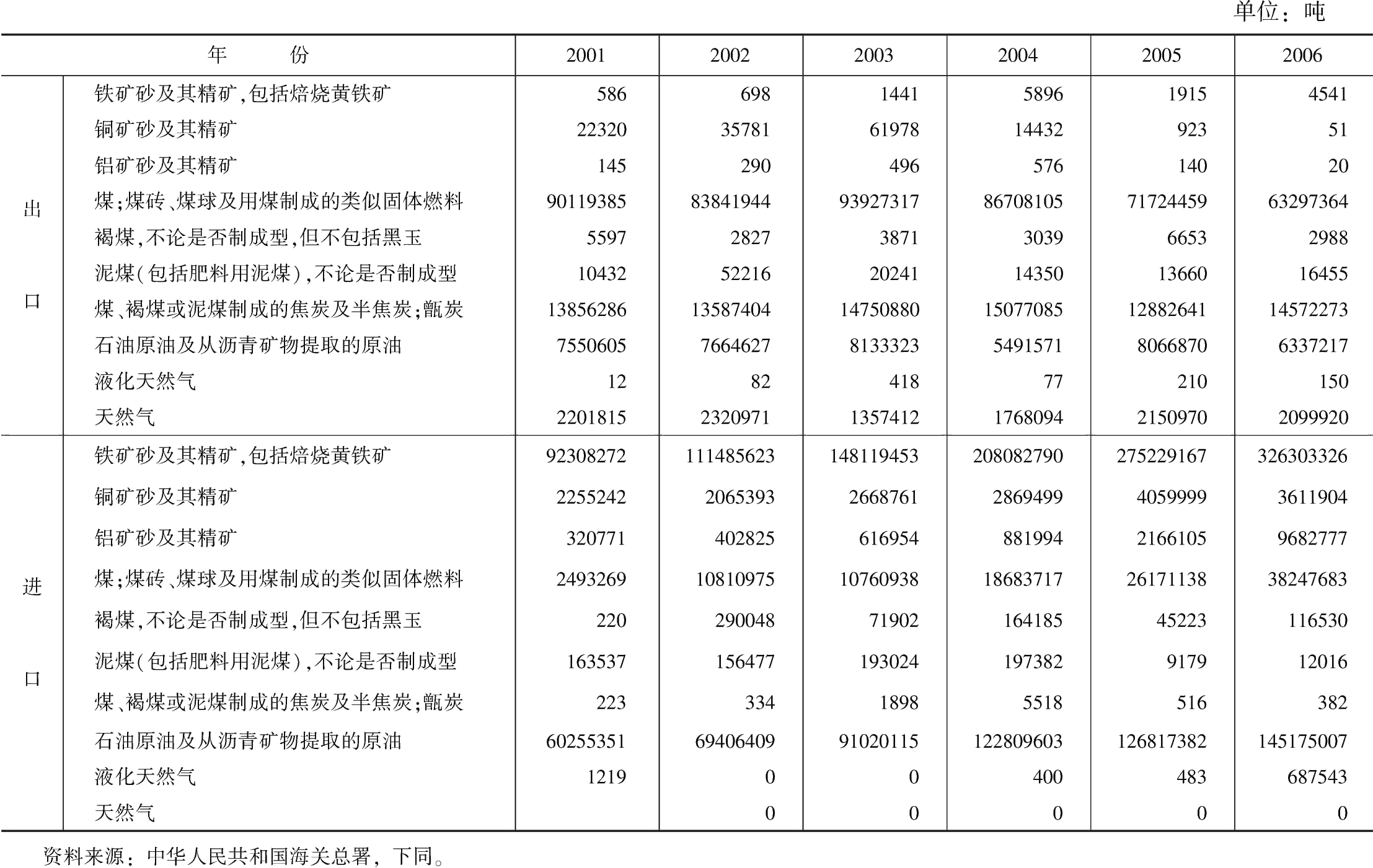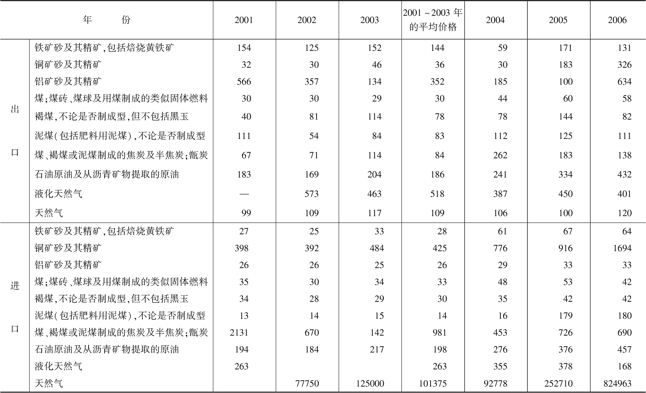 我國主要礦產(chǎn)資源2001~2006年進出口數(shù)量如表13-2所示。從表13-2中可看出2001~2006年我國礦產(chǎn)品進口量有較大幅度的提高,而出口量減少或者變化不大,因而礦產(chǎn)品資源凈進口量有較大程度的提高。