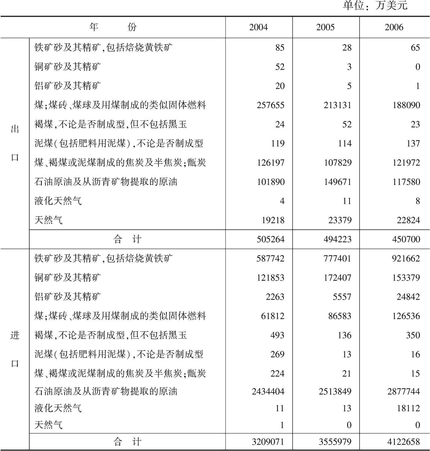 表13-3 中國2001~2006年主要礦產(chǎn)品進出口金額