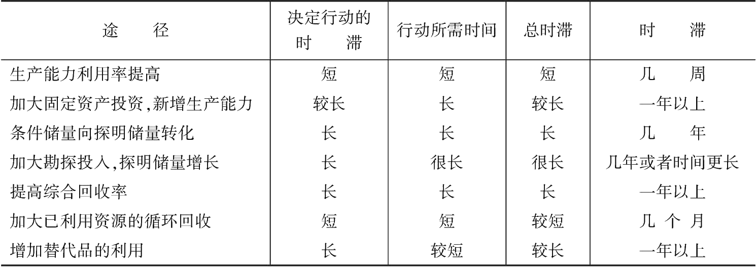 礦產(chǎn)品供求平衡也受價格機制的調節(jié)。供不應求時,價格上漲會引起供給增加,需求減少,從而供求在新的更高價格水平上達到平衡;而供過于求時,價格下降會引起供給減少,需求增加,從而供求在新的更低價格水平上達到平衡。但礦產(chǎn)品與其他商品的區(qū)別是礦產(chǎn)品供給與需求的長期價格彈性均較高,而短期價格彈性均較低。表13-1是價格上漲后,供給增加及需求減少的具體途徑的時滯。