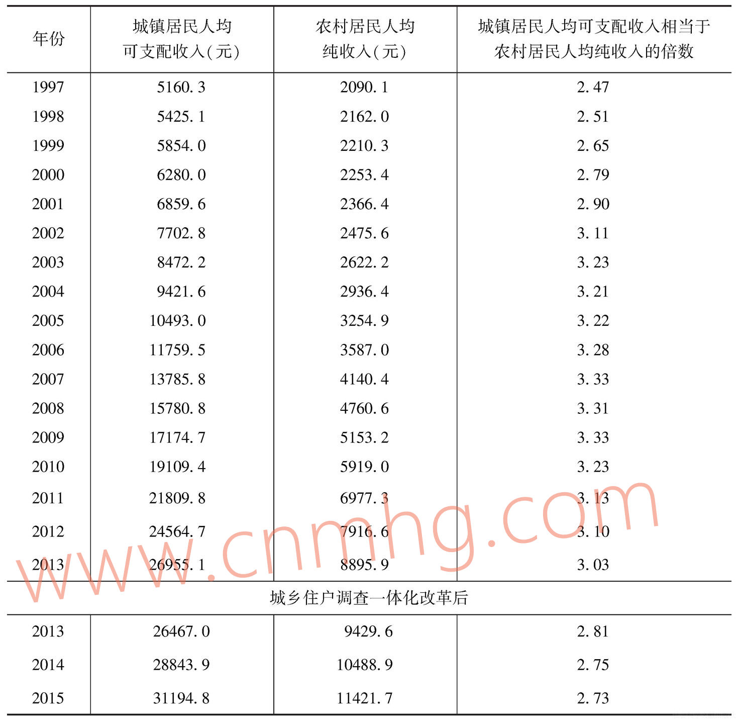 從表1-5城鄉(xiāng)居民人均收入對比可以看出,1979~1984年,由于農(nóng)村實行家庭聯(lián)產(chǎn)承包責(zé)任制,農(nóng)民的生產(chǎn)積極性被迅速調(diào)動起來,收入大幅度提高,農(nóng)民人均純收入的增長速度明顯快于城鎮(zhèn)居民人均可支配收入的增速,城鄉(xiāng)居民人均收入差距明顯縮小。1978年,城鎮(zhèn)居民人均可支配收入是農(nóng)村居民人均純收入的2.57倍,1985年,這一比例已經(jīng)降至1.86倍。1985年以后,隨著城市改革的逐步推進和不斷深化,城市居民的收入增長明顯加快,農(nóng)民收入增長遇到了一些新的困難和制約,增速放緩。1986~2000年,城鄉(xiāng)居民人均收入差距有所擴大,在2~3倍的區(qū)間中波動。進入21世紀(jì)以來,城鄉(xiāng)居民人均收入差距明顯擴大到3倍以上。2009年之后,農(nóng)村居民人均收入增長明顯回升,并高于城鎮(zhèn)居民收入增速,二者收入差距開始緩慢收窄,2013年,城鎮(zhèn)居民人均可支配收入是農(nóng)村居民人均純收入的3.03倍。根據(jù)新口徑數(shù)據(jù)計算,2014年城鎮(zhèn)居民人均可支配收入是農(nóng)村居民人均可支配收入的2.75倍,比2013年降低了0.06倍,延續(xù)了2009年以來城鄉(xiāng)居民收入差距縮小的走勢。2015年城鄉(xiāng)居民收入差距繼續(xù)縮小,城鎮(zhèn)居民人均可支配收入是農(nóng)村居民人均可支配收入的2.73倍。