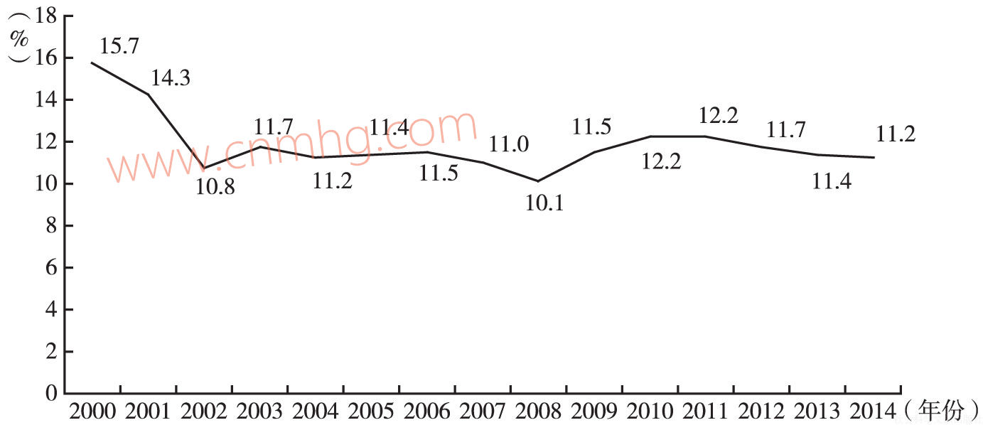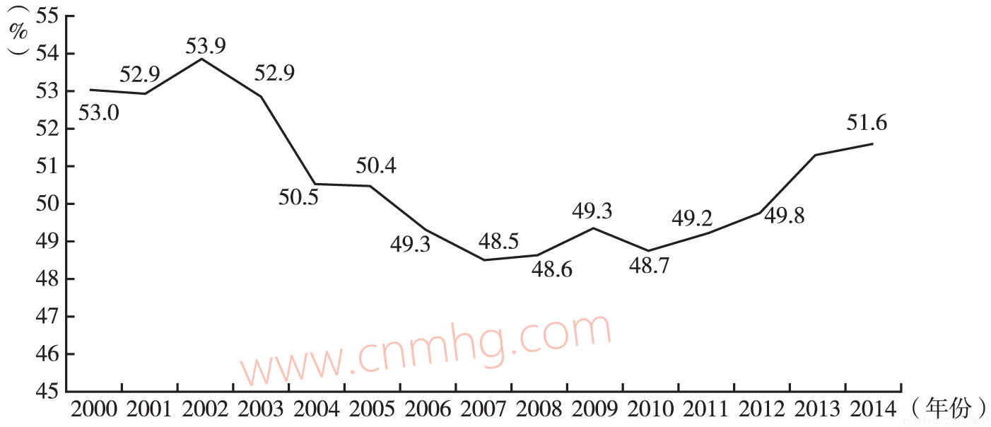 從圖1-2我們可以看到,2000~2007年,勞動者報酬在國民總收入中的比重總體呈下降的趨勢,由2000年53.0%下降至2007年的48.5%。2008~2009年,勞動者報酬占GNI比重明顯上升,達到49.2%,比2007年提高0.7個百分點,2010年有所回落后持續(xù)回升,2014年勞動者報酬達到32.8萬億元,占國民總收入比重為51.6%,比2013年上升0.3個百分點。根據(jù)現(xiàn)有資料推算,2015年勞動者報酬占國民總收入的比重將會繼續(xù)提高。勞動者報酬是居民收入的主要來源,占居民可支配收入的比重超過80%,勞動者報酬平穩(wěn)較快增長有利于提高居民收入比重,改善宏觀收入分配格局。