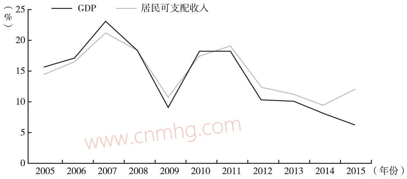 圖1-1 2005年以來GDP、居民可支配收入的名義增長率