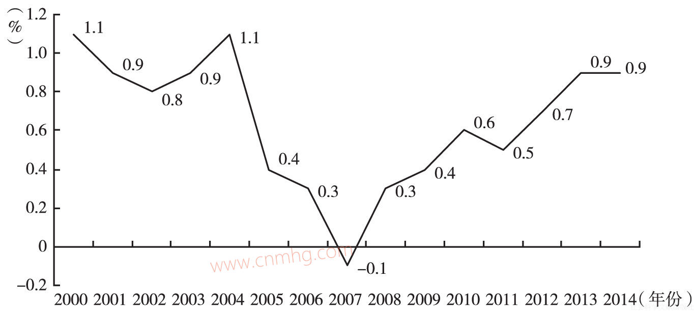 居民經(jīng)常轉(zhuǎn)移凈收入總量并不大,其占居民可支配收入的比重絕大多數(shù)年份都低于1%(見圖1-8),但對于發(fā)揮財政的再分配功能,調(diào)節(jié)居民收入差距具有十分重要的意義。從2000年以來的數(shù)據(jù)看,2000~2004年,經(jīng)常轉(zhuǎn)移凈收入占可支配收入的比重比較穩(wěn)定,基本上圍繞1%窄幅波動,但2005~2007年,這一比重出現(xiàn)了明顯的下降,2007年經(jīng)常轉(zhuǎn)移凈收入甚至為-175.2億元。2007年之后,隨著財政部門民生支出力度不斷加大,居民轉(zhuǎn)移收入增長較快,經(jīng)常轉(zhuǎn)移凈收入占比增長緩慢但持續(xù)地回升,2013年已經(jīng)達到0.9%的水平,2014年經(jīng)常轉(zhuǎn)移凈收入占比維持在0.9%的水平上。