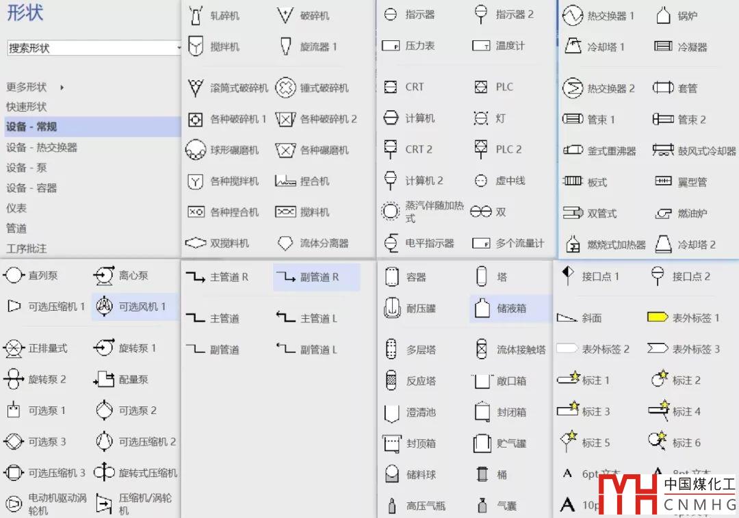 簡(jiǎn)單介紹下Visio,它是Office下的一個(gè)組件,是一款極易上手的面向?qū)ο?、矢量化的繪圖程序(矢量圖的好處就是無論放大多少倍圖片依舊清晰),用它畫圖和用PPT畫圖類似(但效率會(huì)更高哦!),并可與Office、CAD無縫集成!更關(guān)鍵的是,Visio還內(nèi)置了多種模板與形狀,比如,Visio中內(nèi)置了標(biāo)準(zhǔn)且豐富的管道、閥門、設(shè)備、容器等模具: