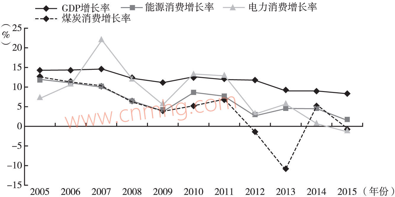 “十一五”以來,能源消費(fèi)、煤炭消費(fèi)和電力消費(fèi)與全省經(jīng)濟(jì)增長趨勢基本一致,但在2013年能源消費(fèi)和煤炭消費(fèi)增長出現(xiàn)了拐點(diǎn)。從圖2可以看出,電力消費(fèi)、能源消費(fèi)、煤炭消費(fèi)均與經(jīng)濟(jì)增長相關(guān)性較為明顯。