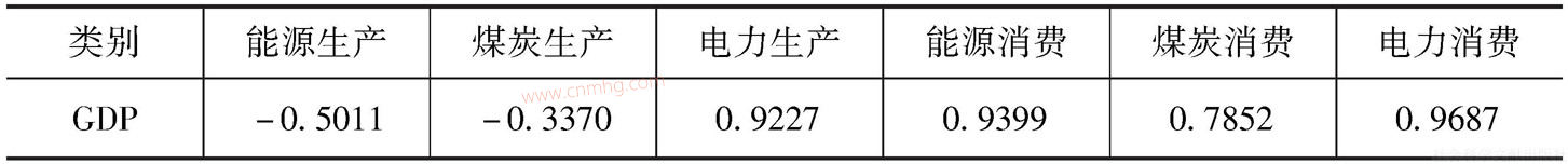 根據(jù)Person法檢驗(yàn),2005~2015年河南能源生產(chǎn)、煤炭生產(chǎn)與地區(qū)生產(chǎn)總值不存在顯著相關(guān)關(guān)系(見表1);電力生產(chǎn)和消費(fèi)、能源和煤炭消費(fèi)與地區(qū)生產(chǎn)總值均存在顯著正相關(guān),其中電力生產(chǎn)和消費(fèi)與地區(qū)生產(chǎn)總值相關(guān)系數(shù)分別為0.92和0.97,能源消費(fèi)與地區(qū)生產(chǎn)總值的相關(guān)系數(shù)為0.94,而煤炭消費(fèi)與地區(qū)生產(chǎn)總值的相關(guān)系數(shù)為0.79。