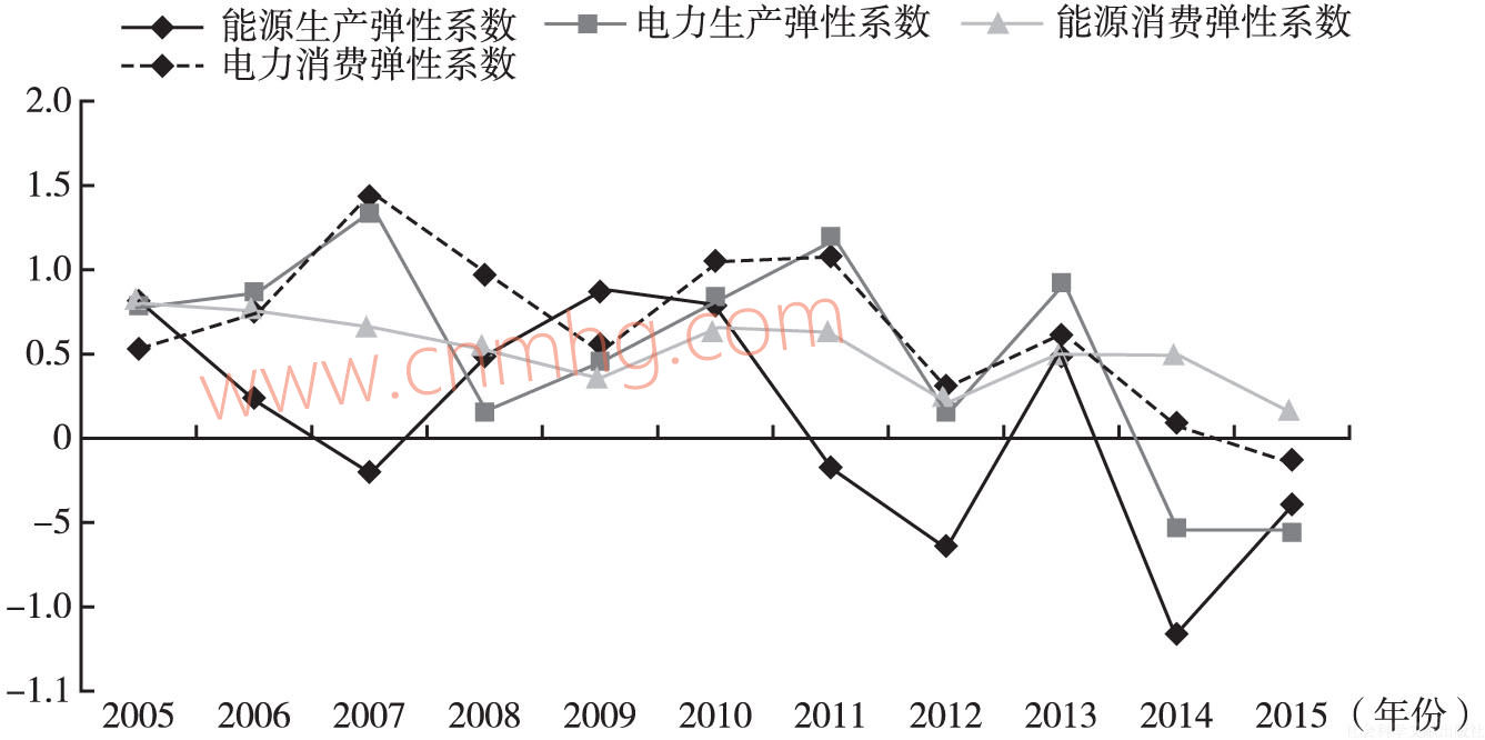 圖5 2005~2015年河南省能源和電力生產(chǎn)彈性系數(shù)與消費(fèi)彈性系數(shù)變化趨勢
