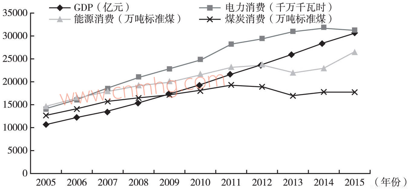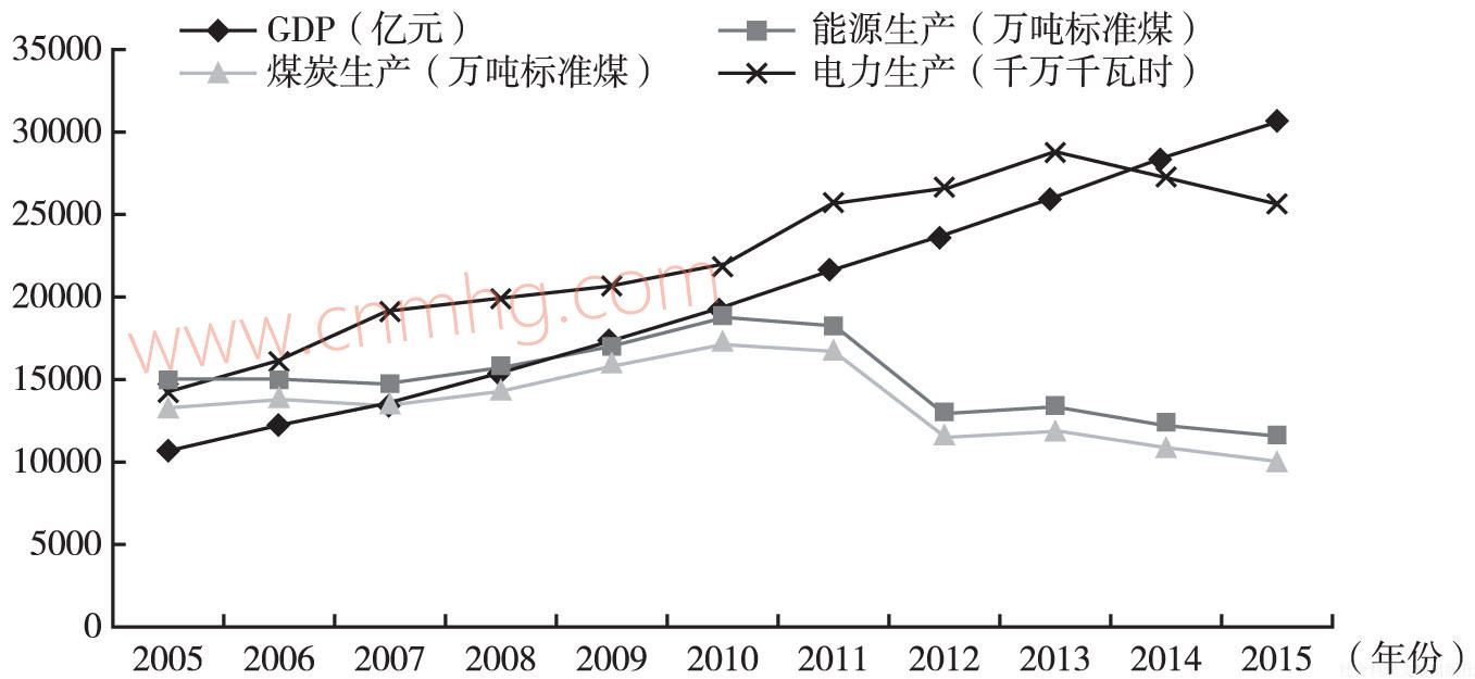 圖1 2005~2015年河南分類能源生產(chǎn)與地區(qū)生產(chǎn)總值變化趨勢