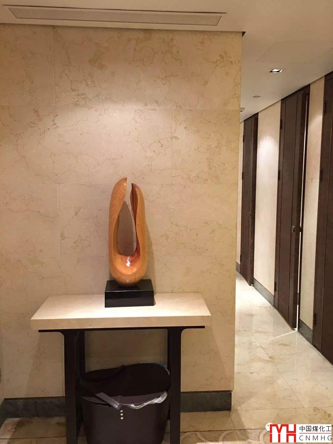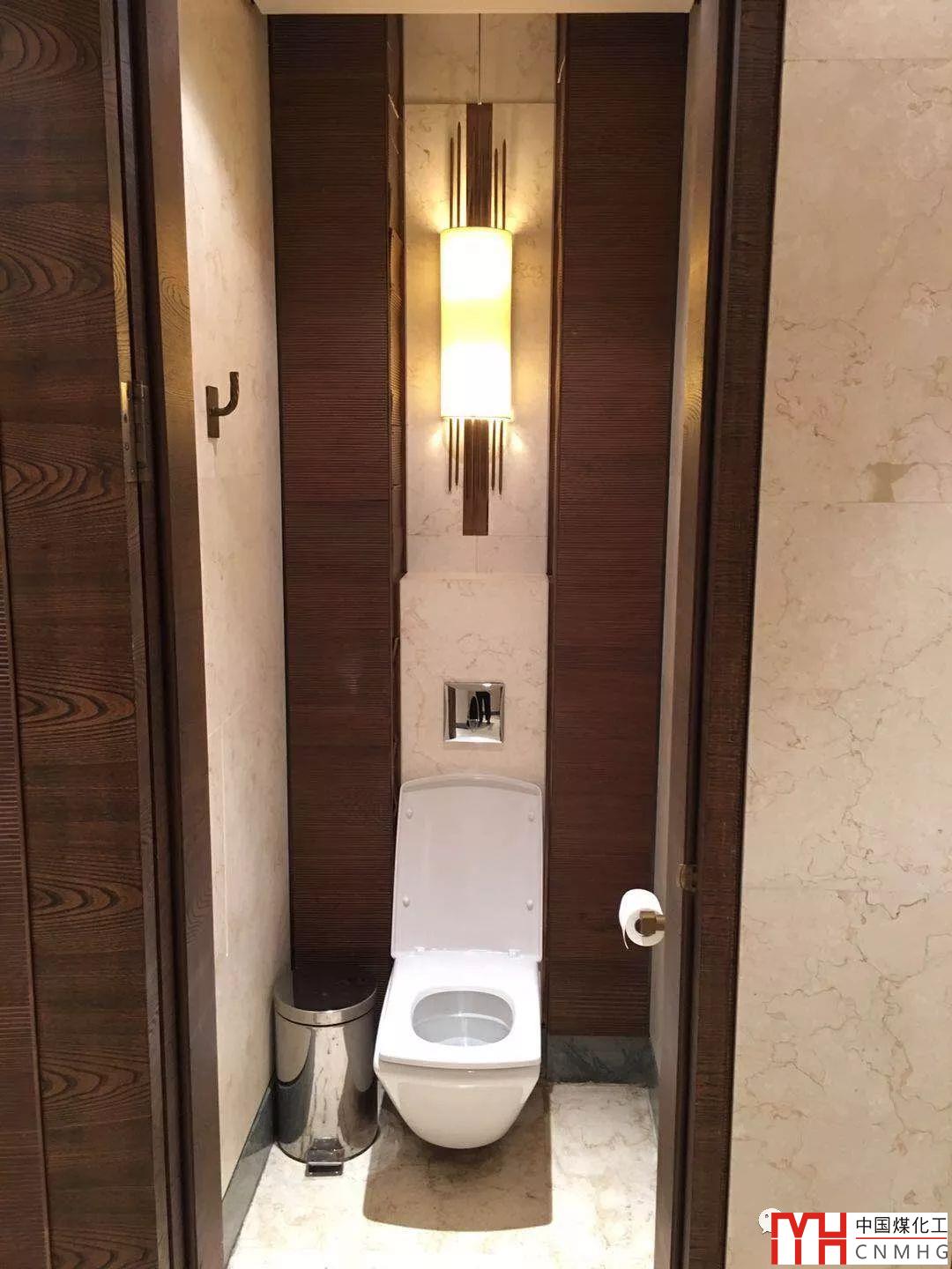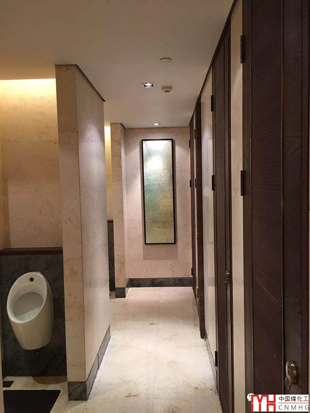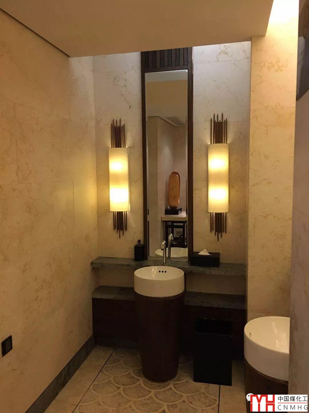 進(jìn)入衛(wèi)生間,首先映入眼簾的是米黃色石材與深褐色木質(zhì)材料相結(jié)合的裝修,可圈可點(diǎn)。先是一個(gè)小的“玄關(guān)”,從照片上看根本不像衛(wèi)生間,顯得很有檔次。實(shí)墻前面的小的擺件(工藝品)與酒店其他場(chǎng)所的擺件風(fēng)格相一致,通過重點(diǎn)照明照射在擺件上,顯得很高大上。重點(diǎn)照明系數(shù)大約在5倍左右。筆者認(rèn)為,如果重點(diǎn)照明系數(shù)加大到20倍左右,效果可能更佳。