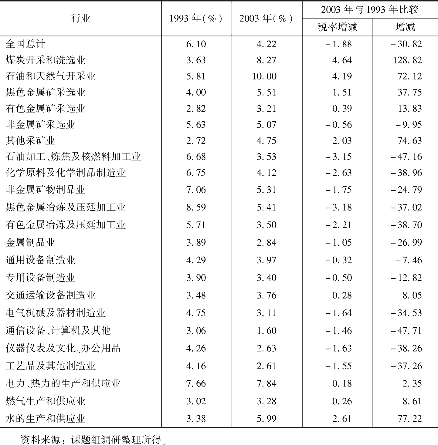 表5 2003年與1993年分行業(yè)工業(yè)企業(yè)增值稅和營(yíng)業(yè)稅負(fù)擔(dān)對(duì)比