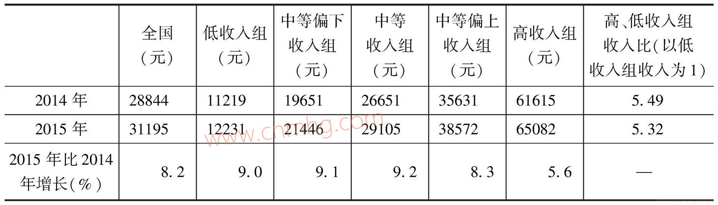 據(jù)國家統(tǒng)計(jì)局對全國31個?。ㄗ灾螀^(qū)、直轄市)16萬戶居民家庭開展的城鄉(xiāng)一體化住戶調(diào)查[1],2015年,全國城鎮(zhèn)居民人均可支配收入實(shí)際增長6.6%,繼續(xù)保持平穩(wěn)增長;同時,中低收入組居民收入增速快于高收入組,中西部地區(qū)居民收入增速快于東部地區(qū),城鎮(zhèn)居民內(nèi)部和地區(qū)間的收入差距均有所縮小,收入分配狀況進(jìn)一步改善。