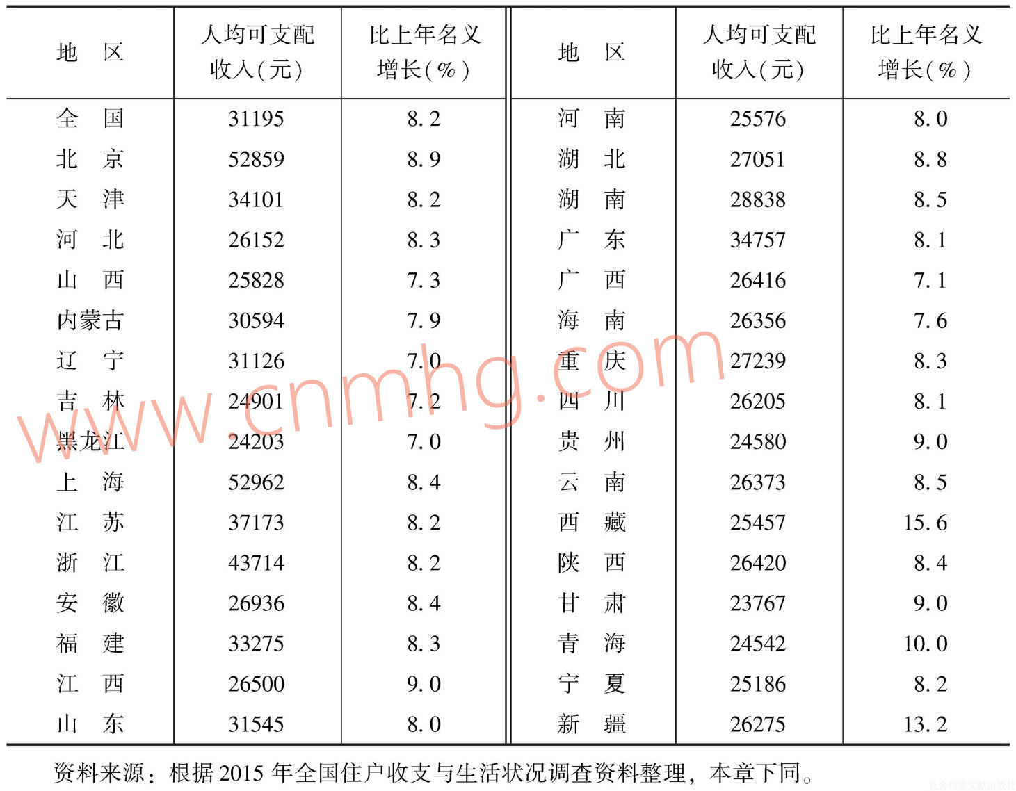 表3-1 2015年各?。▍^(qū)、市)城鎮(zhèn)居民人均可支配收入和名義增長率