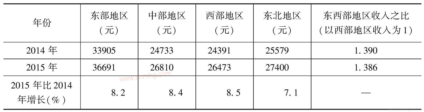(2)地區(qū)之間的收入差距有所縮小。抽樣調(diào)查數(shù)據(jù)顯示,2015年東部、中部、西部和東北地區(qū)城鎮(zhèn)居民的收入之比為138.6∶101.3∶100∶103.5(2014年為139.0∶101.4∶100∶104.9)。中西部與東部地區(qū)之間的收入差距較上年有所縮小,而東北與東部地區(qū)之間的收入差距有所擴(kuò)大。