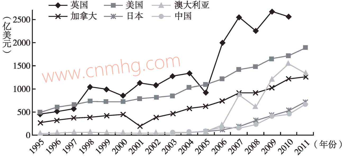 礦產(chǎn)資源是采礦行業(yè)的利潤來源。由于國內(nèi)的礦產(chǎn)資源有限,采礦企業(yè)要在海外開拓礦產(chǎn)資源。采掘業(yè)是中國對外投資的第二大行業(yè),僅次于商務(wù)服務(wù)業(yè),占對外投資額的15%左右。2011年中國非金融類跨國公司按年末對外直接投資存量排序,礦產(chǎn)行業(yè)的中石化、中石油、中海油位列前3名,五礦集團、中國鋁業(yè)、中化集團分別位列第7、9、10名??梢姾M馔顿Y對采礦企業(yè)的重要性。近年來比較典型的案例有中金嶺南聯(lián)合印度尼西亞的安塔公司收購澳大利亞先驅(qū)公司,中國鋁業(yè)聯(lián)合美國鋁業(yè)收購澳大利亞力拓集團的部分股份,中國五礦集團收購世界第二大鋅礦開采商澳大利亞OZMineral,中國海洋石油有限公司收購加拿大尼克森公司。根據(jù)商務(wù)部的數(shù)據(jù),近年來中國采掘業(yè)對外直接投資流量整體呈現(xiàn)上漲趨勢(見圖6),但波動較大,2006、2009、2011年較高,是臨近年份的2倍。非金融類對外直接投資年流量近年來快速增長,2011年流量為685.8億美元,比2003年增長23倍,而同期采掘業(yè)對外直接投資僅增長了9倍,使得采掘業(yè)對外直接投資占非金融類的比例下降,從2003年的48%下降到2011年的21%。這顯示了中國對外投資結(jié)構(gòu)的變化,企業(yè)將資金投入到采掘業(yè)以外的行業(yè)。根據(jù)商務(wù)部的數(shù)據(jù),中國采掘業(yè)對外直接投資2011年末的存量為670億美元,位于世界前列,與日本相當(dāng),是美國的1/3。對外直接投資存量最大的國家是英國、美國、澳大利亞、加拿大,這些都是世界上礦產(chǎn)資源豐富的國家。與2004年末的存量相比,中國采掘業(yè)對外直接投資存量在7年間增長了10倍,而澳大利亞同期增長了25倍,是增長速度最快的國家。美國、加拿大分別增長了83%、118%,由于這些國家的存量基數(shù)大,雖然增長速度不高,但增量相當(dāng)大。可見,各國都努力搶占海外資源,采掘業(yè)的競爭變?yōu)橘Y源控制權(quán)的競爭。