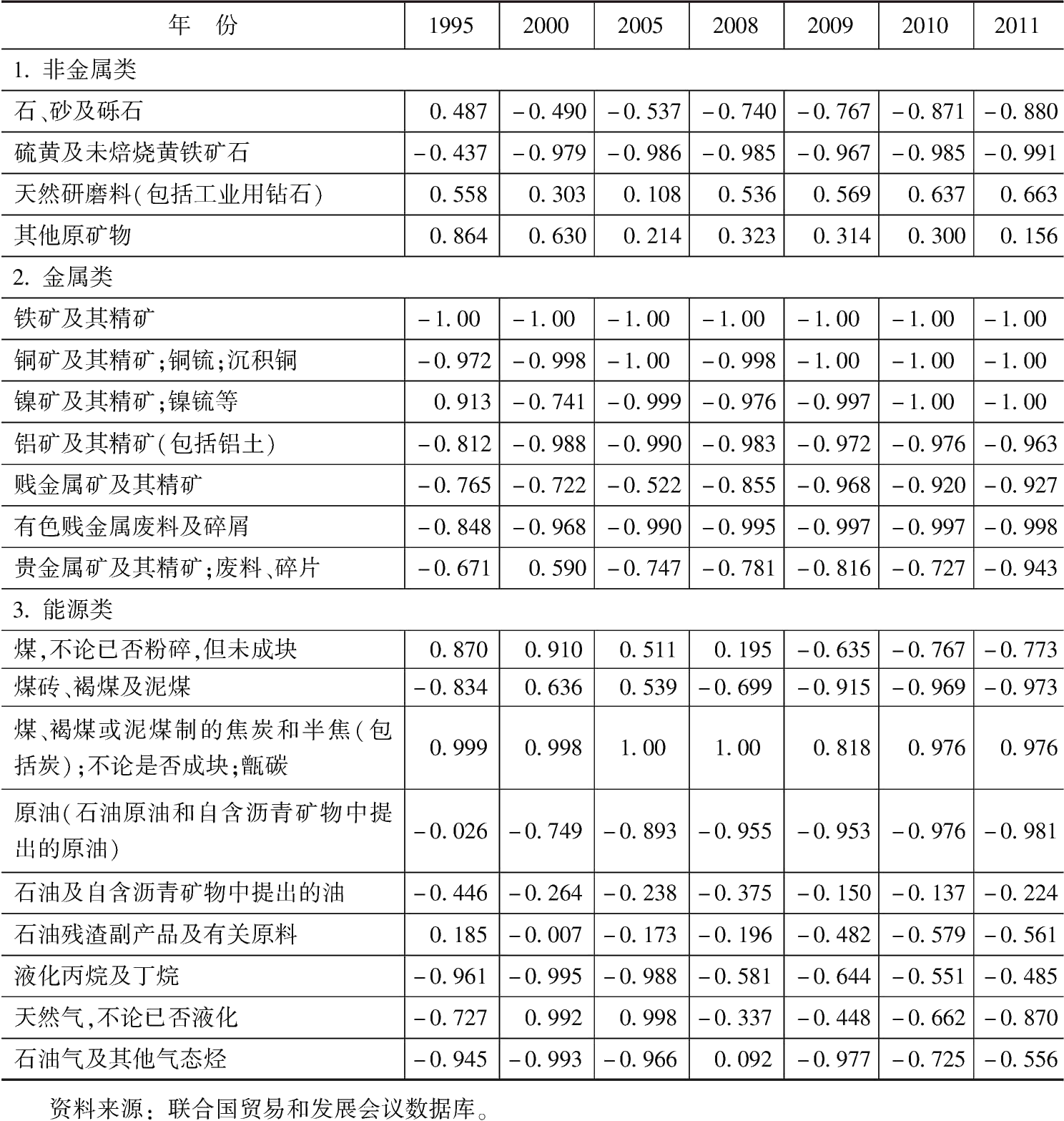 表1 中國采掘業(yè)產(chǎn)品的貿(mào)易競爭力