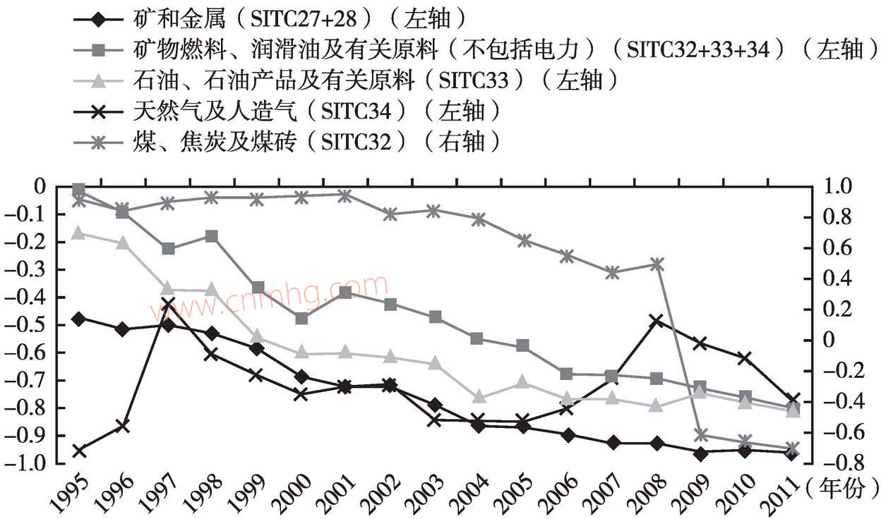 在細分行業(yè)中(見表1),大部分都是進口遠超過出口,例如各種金屬礦、原油、天然氣基本只有進口,貿(mào)易競爭力指數(shù)接近-100%,中國的這些礦產(chǎn)資源匱乏,缺乏競爭力,大量國有礦山面臨資源枯竭。一些傳統(tǒng)的優(yōu)勢行業(yè)的競爭力快速下降,例如未成塊煤(SITC321)的競爭力從2000年的91%迅速下降到2011年的-77.3%,這部分是由煤炭出口的政策調(diào)整導(dǎo)致的。只有天然研磨料,其他原礦物,煤、褐煤或泥煤制的焦炭和半焦、甑碳(SITC325)這3類是出口大于進口,天然研磨料的貿(mào)易競爭力還從1995年的55.8%提升到2011年的66.3%,煤、褐煤或泥煤制的焦炭和半焦、甑碳的貿(mào)易競爭力一直保持在97%左右的高水平,是中國具有很強競爭力的礦產(chǎn)資源。造成中國采掘業(yè)產(chǎn)品貿(mào)易競爭力迅速下降的原因是經(jīng)濟發(fā)展導(dǎo)致對礦產(chǎn)品和能源的需求大幅上升,房地產(chǎn)、汽車的飛速發(fā)展推動了鋼鐵、建材、基礎(chǔ)設(shè)施的發(fā)展,原材料需求增長,國內(nèi)礦產(chǎn)資源供給不足以滿足快速增長的需求,只能依靠大量進口來彌補缺口。