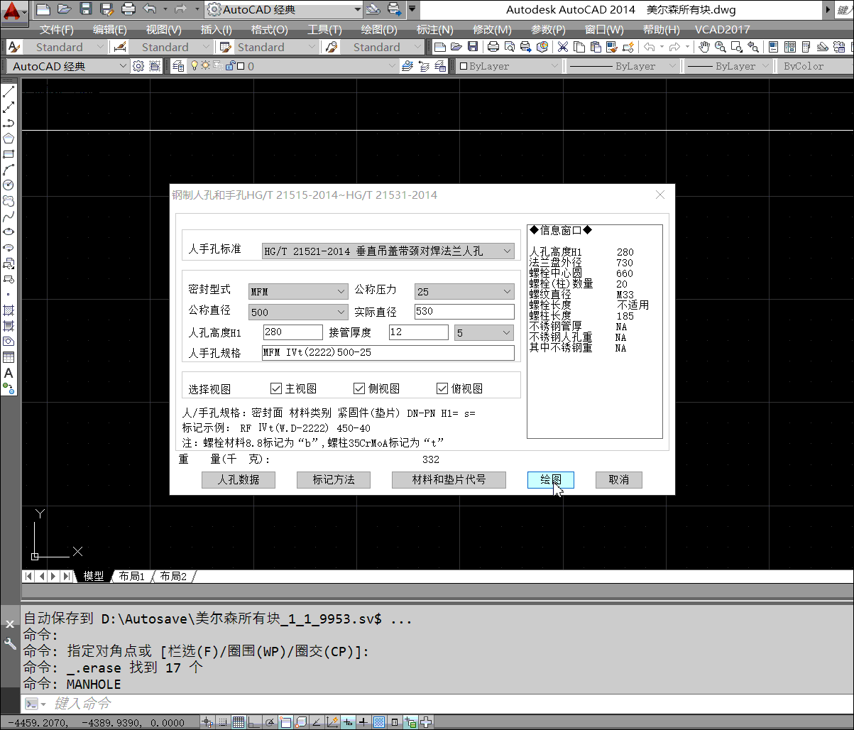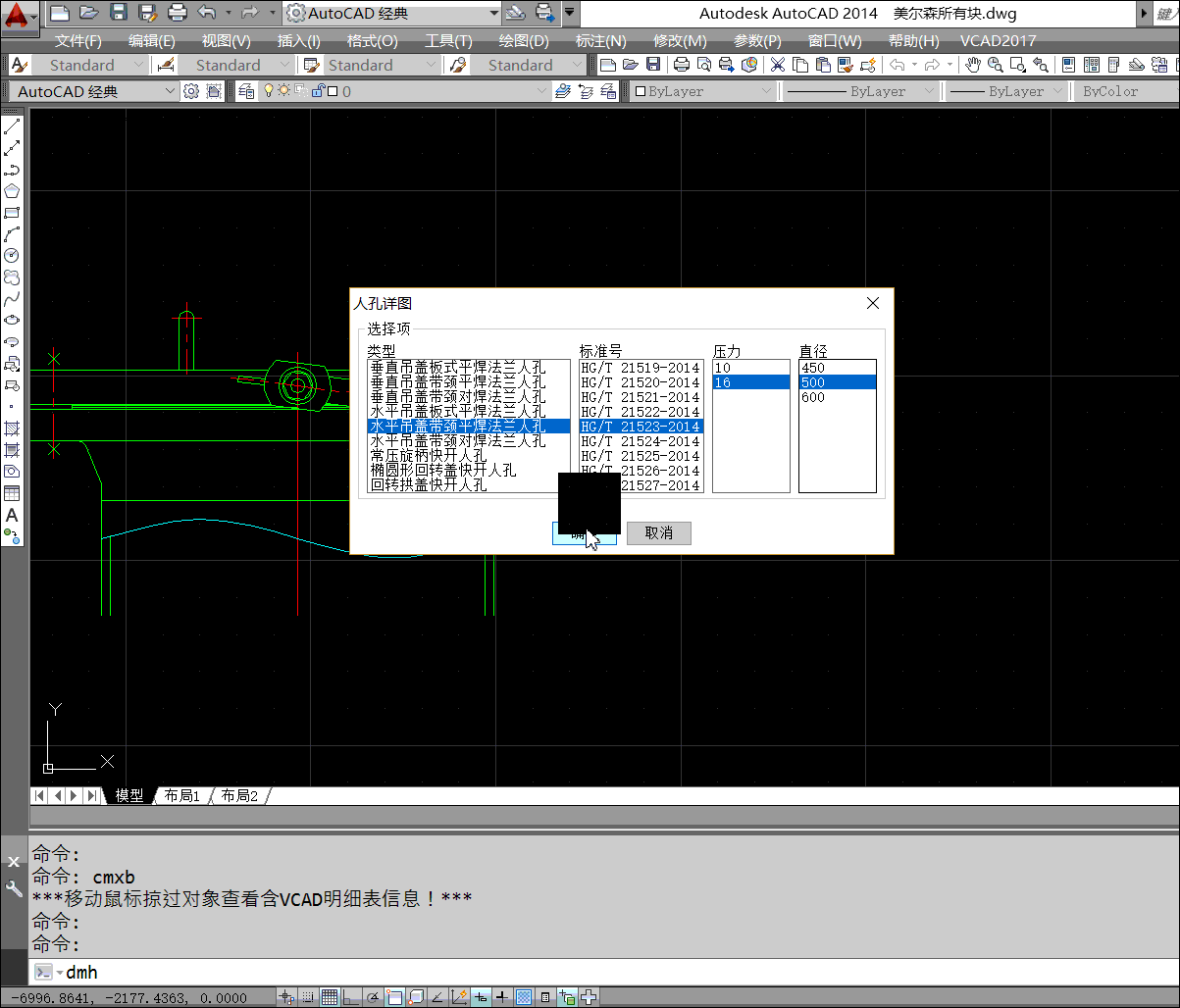 為了順利繪制人孔,VCAD將HG/T 21515-2014~HG/T 21531-2014的簡圖三視圖全部繪制,并用程序調用出來,方便使用。