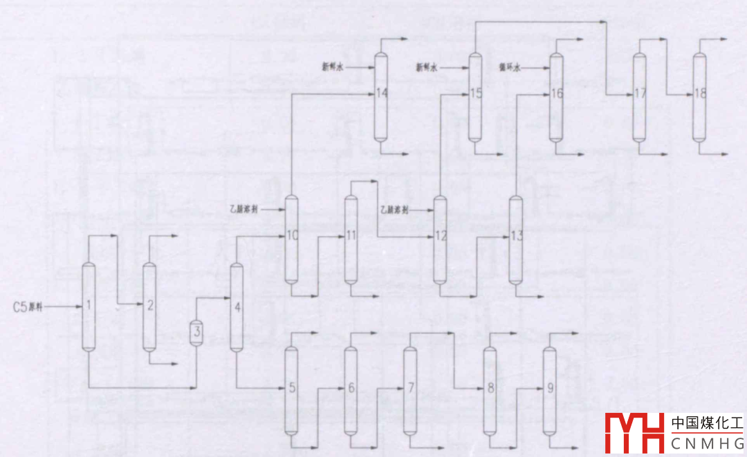 CAN法由日本合成橡膠、埃克森美孚等公司均分別成功開(kāi)發(fā),是國(guó)外廣泛采用的分離工藝,其原理與DMF法相同,技術(shù)相似,只是在操作或流程上稍有差異。該方法溶劑乙腈原料豐富,價(jià)格低廉,但異戊二烯純度不高,要滿足聚合級(jí)異戊二烯的生產(chǎn)要求,則生產(chǎn)過(guò)程復(fù)雜,生產(chǎn)成本大幅度提高。