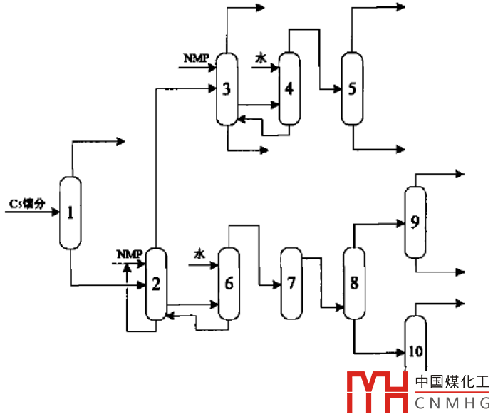 NMP法由德國(guó)BASF公司最先開(kāi)發(fā),采用NMP預(yù)洗方式除去環(huán)戊二烯、1,3-戊二烯和2-丁炔,隨后又進(jìn)行了工藝改進(jìn)。該工藝過(guò)程采用一次萃取精餾,一次汽提,異戊二烯收率可以達(dá)到97%以上。該方法的優(yōu)點(diǎn)是工藝流程相對(duì)比較簡(jiǎn)單,溶劑毒性小,能耗較低,可避免二烯烴聚合反應(yīng)的發(fā)生,缺點(diǎn)是異戊二烯純度較低。